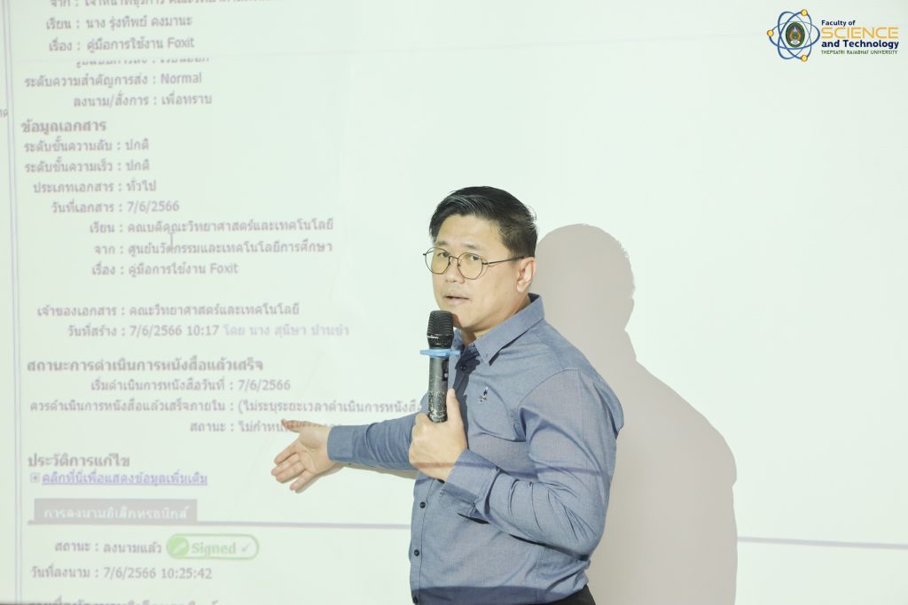 คณะวิทยาศาสตร์และเทคโนโลยี มหาวิทยาลัยราชภัฏเทพสตรี ได้จัดการอบรมระบบงานสารบรรณอิเล็กทรอนิกส์ เพื่อให้ความรู้แก่ผู้บริหารอาจารย์ และเจ้าหน้าที่ของคณะ ได้เรียนรู้การใช้งานระบบสารบรรณอิเล็กทรอนิกส์ในรูปแบบลายเซ็นอิเล็กทรอนิกส์ วิทยากรได้รับเกียรติจาก ผศ.ไชยพล กลิ่นจันทร์ ผู้อำนวยการสำนักวิทยบริการและเทคโนโลยีสารสนเทศ มหาวิทยาลัยราชภัฎเทพสตรี และ นายณัฐธัญพงศ์ ศรนารายณ์ นักวิชาการคอมพิวเตอร์ชํานาญการ ศูนย์นวัตกรรมและเทคโนโลยีการศึกษา มาให้ความรู้และความเข้าใจในการใช้ระบบงานสารบรรณอิเล็กทรอนิกส์ในรูปแบบลายเซ็นอิเล็กทรอนิกส์ในครั้งนี้