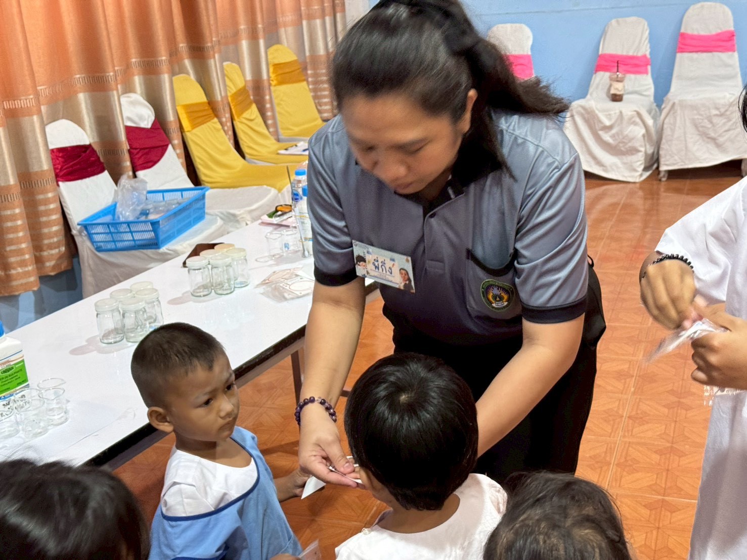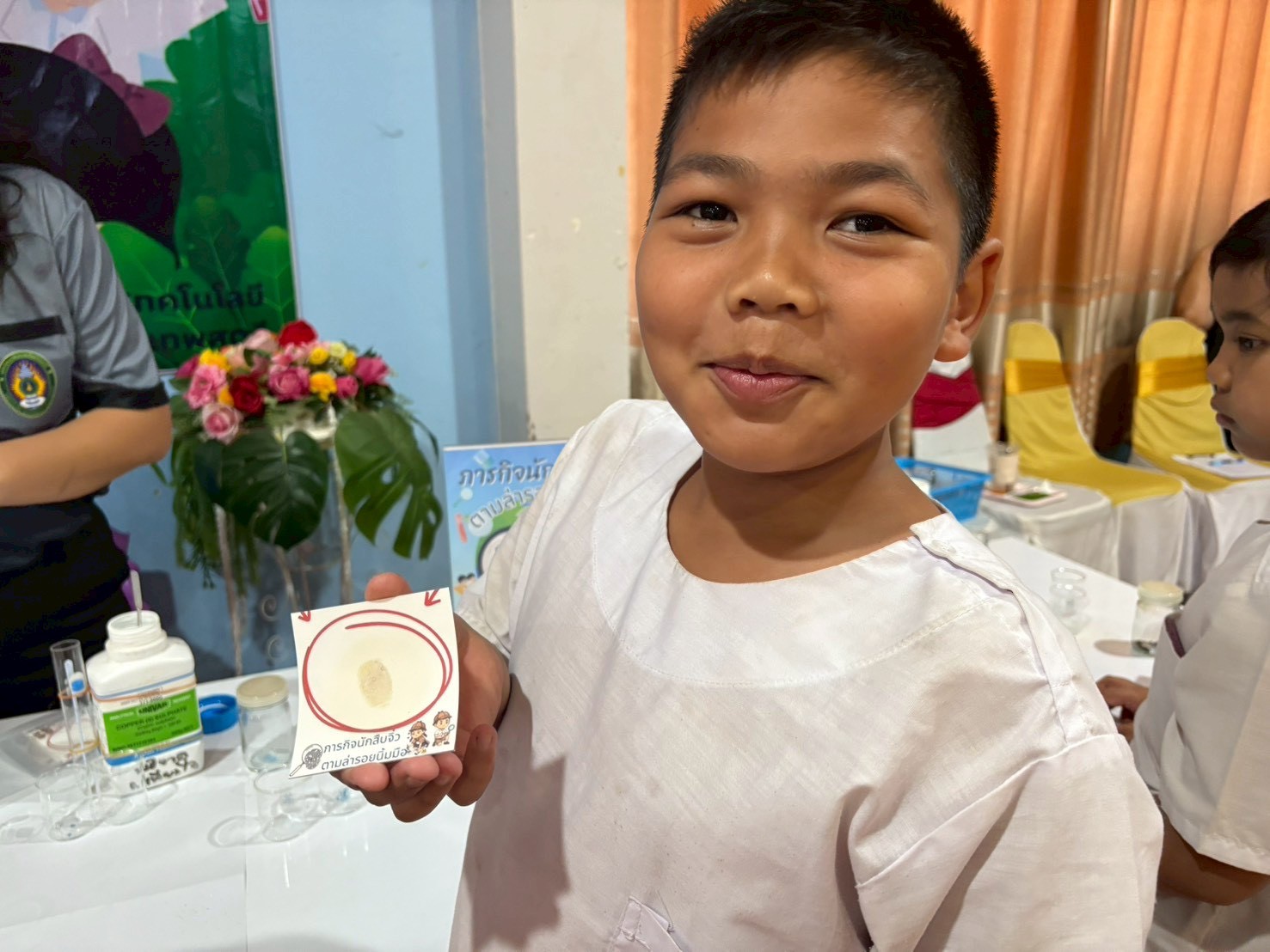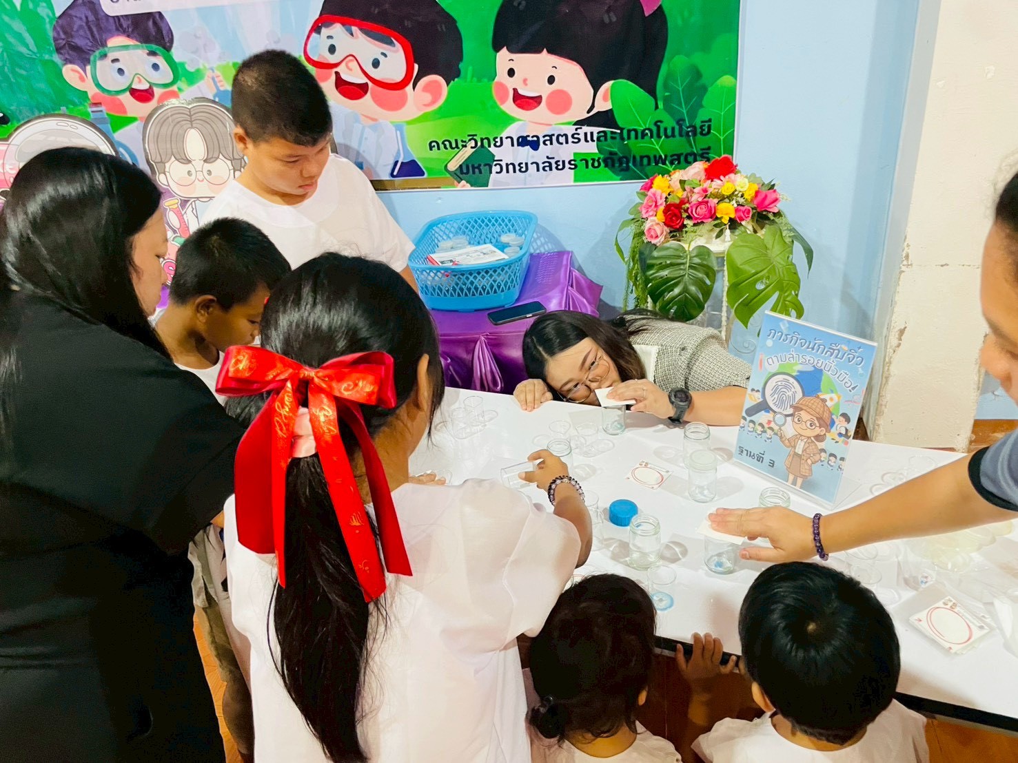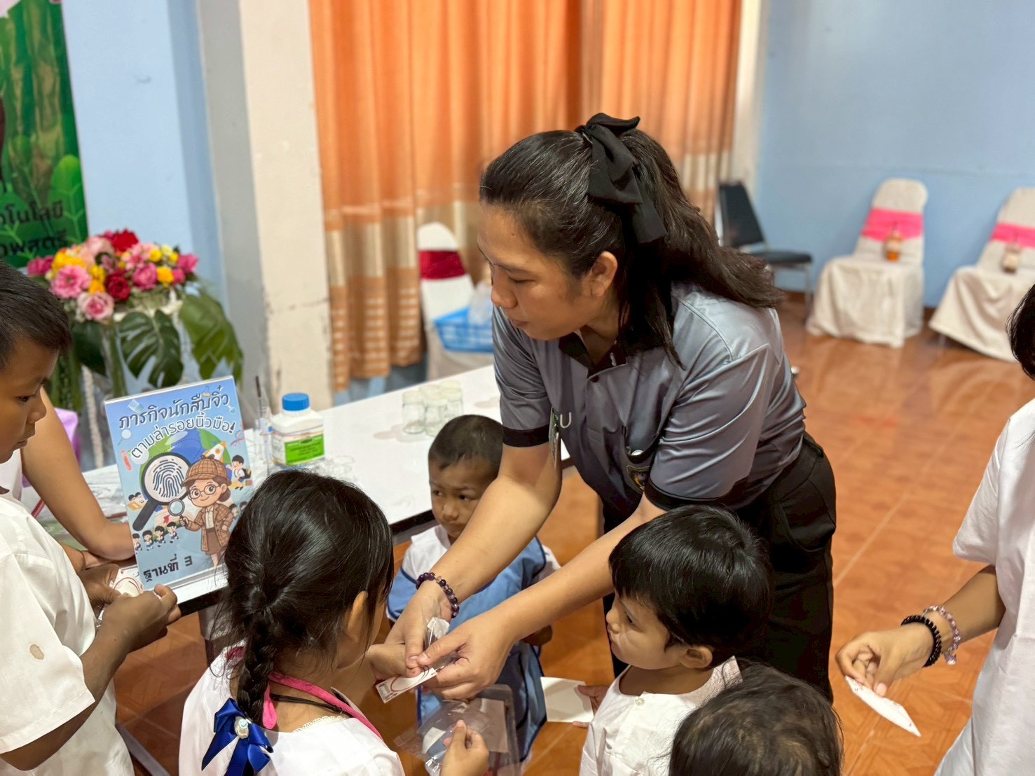 ฐานที่ 3 กิจกรรม ภารกิจนักสืบจิ๋วตามล่ารอยนิ้วมือ ผู้รับผิดชอบกิจกรรมคือ นางสาวกิ่งนภา เอี่ยมชุ่ม นักวิทยาศาสตร์