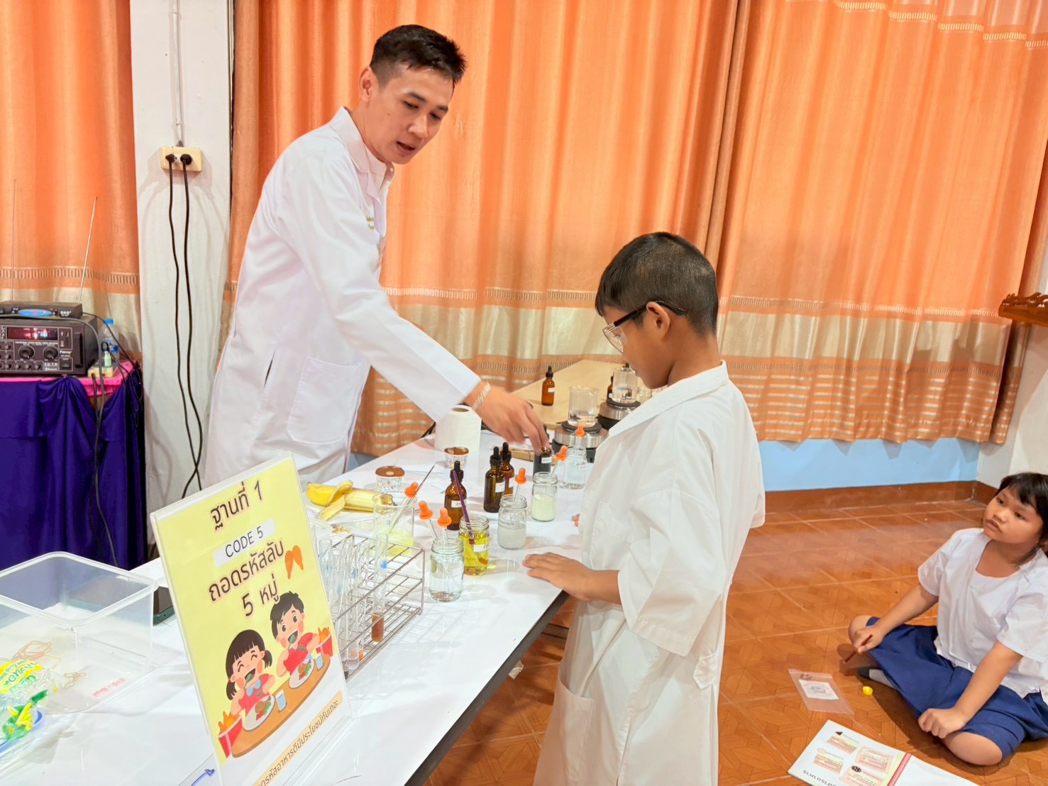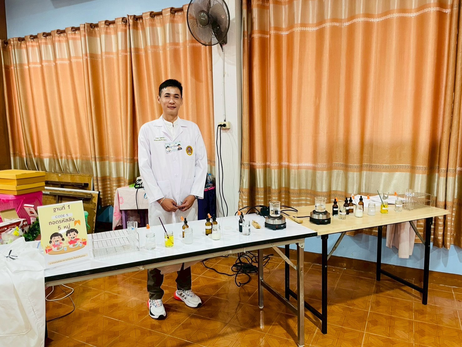 ฐานที่ 1 กิจกรรม CODE 5 ถอดรหัสลับ 5 หมู่ ผู้รับผิดชอบกิจกรรมคือ นายอำพล พุ่มไพจิตร นักวิทยาศาสตร์ชำนาญการ