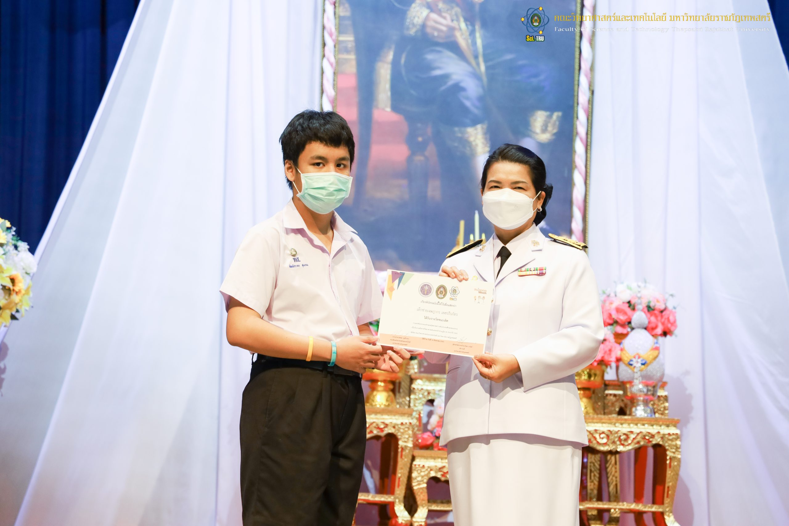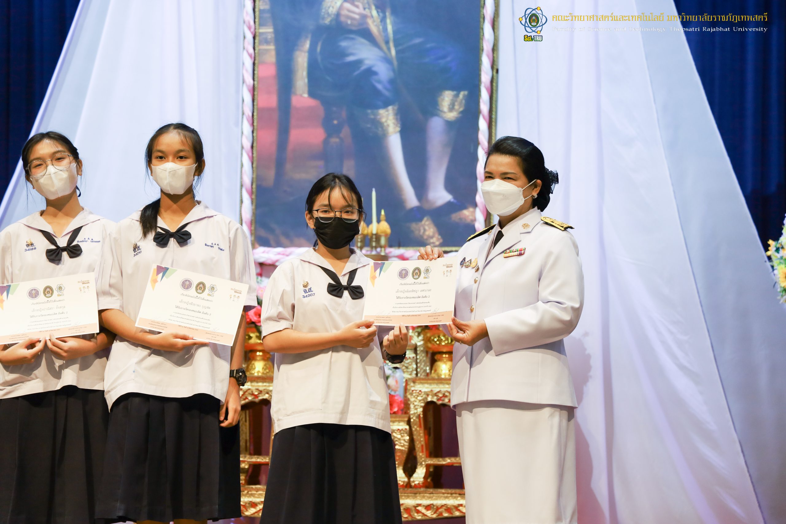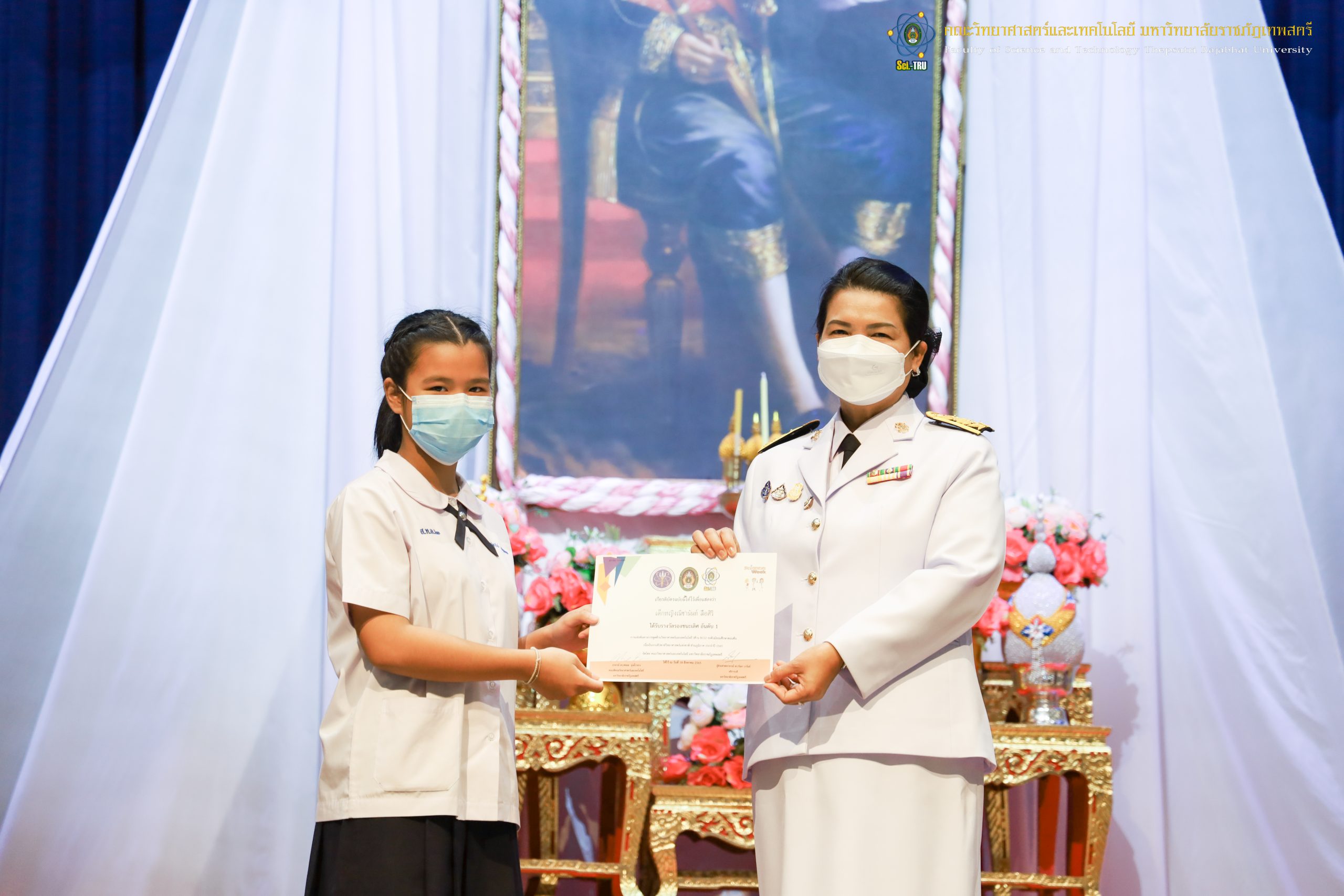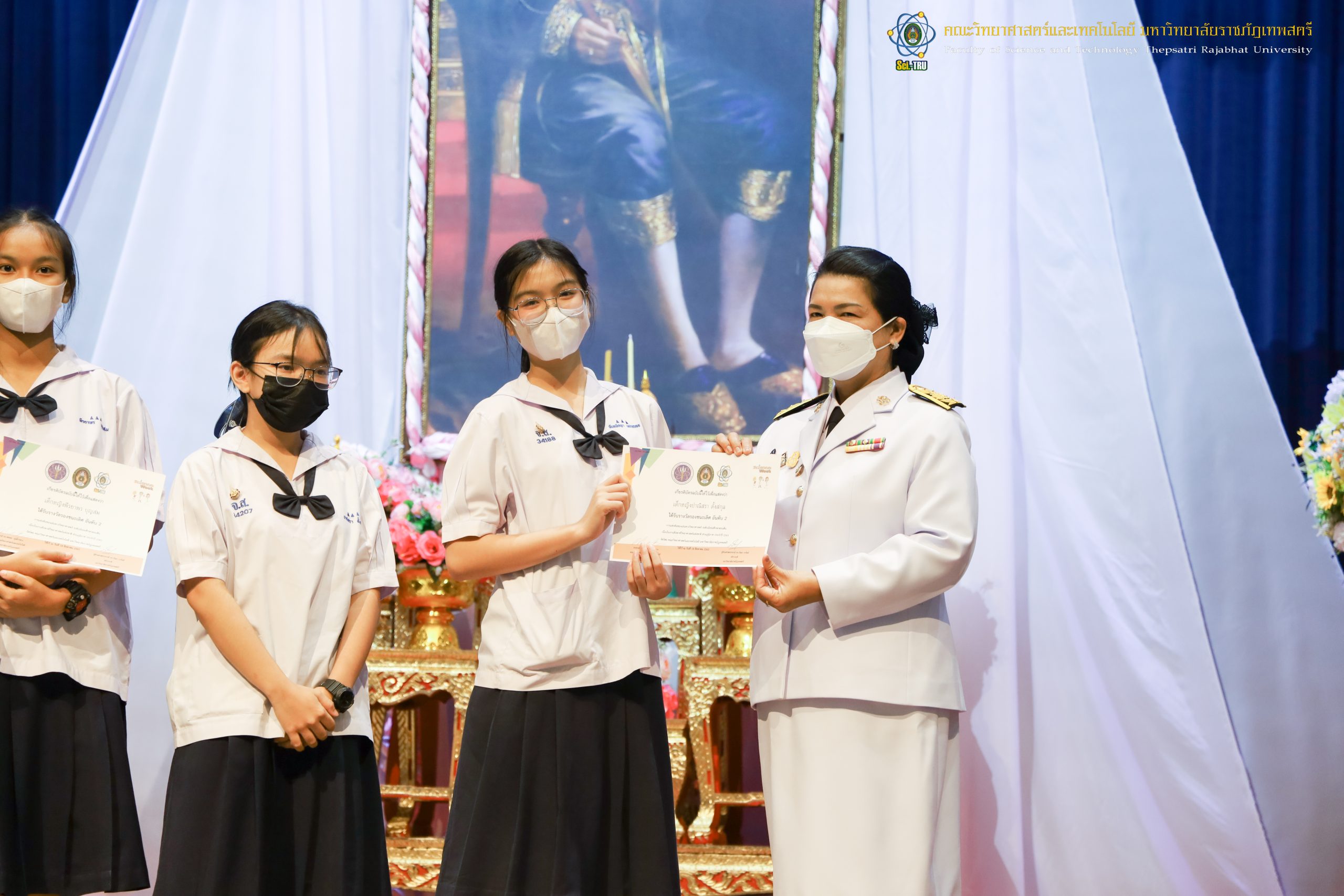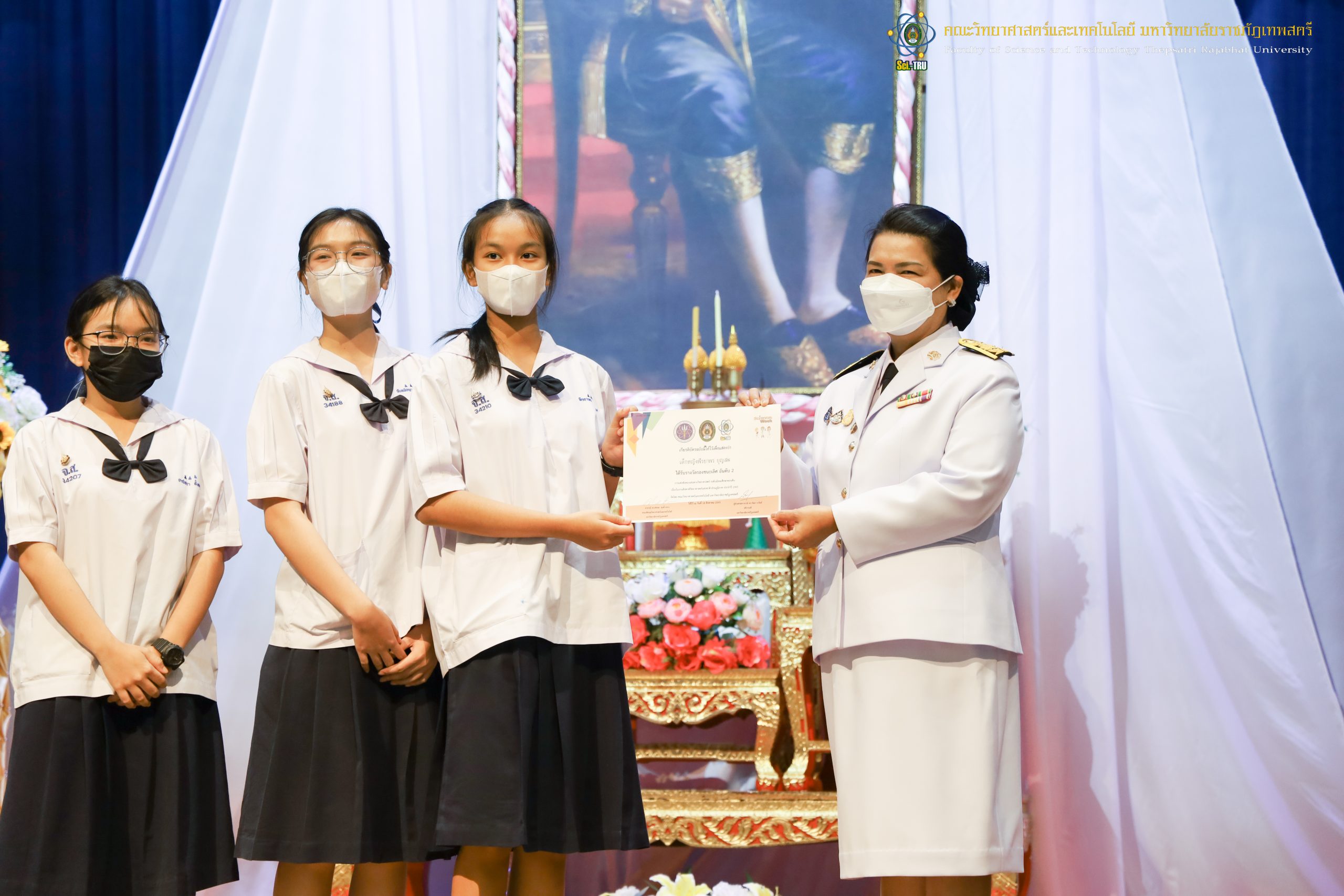 จากนั้น ผศ.ดร.กันยา บาร์นท์ อธิการบดีมหาวิทยาลัยราชภัฏเทพสตรี ได้ให้เกียรติเป็นประธานในพิธีมอบประกาศนียบัตรแก่นักเรียนที่ได้รับรางวัลจากการประกวดแข่งขันประเภทต่าง ๆ ในงานสัปดาห์วิทยาศาสตร์แห่งชาติ ส่วนภูมิภาค ประจำปี 2565 ด้วย