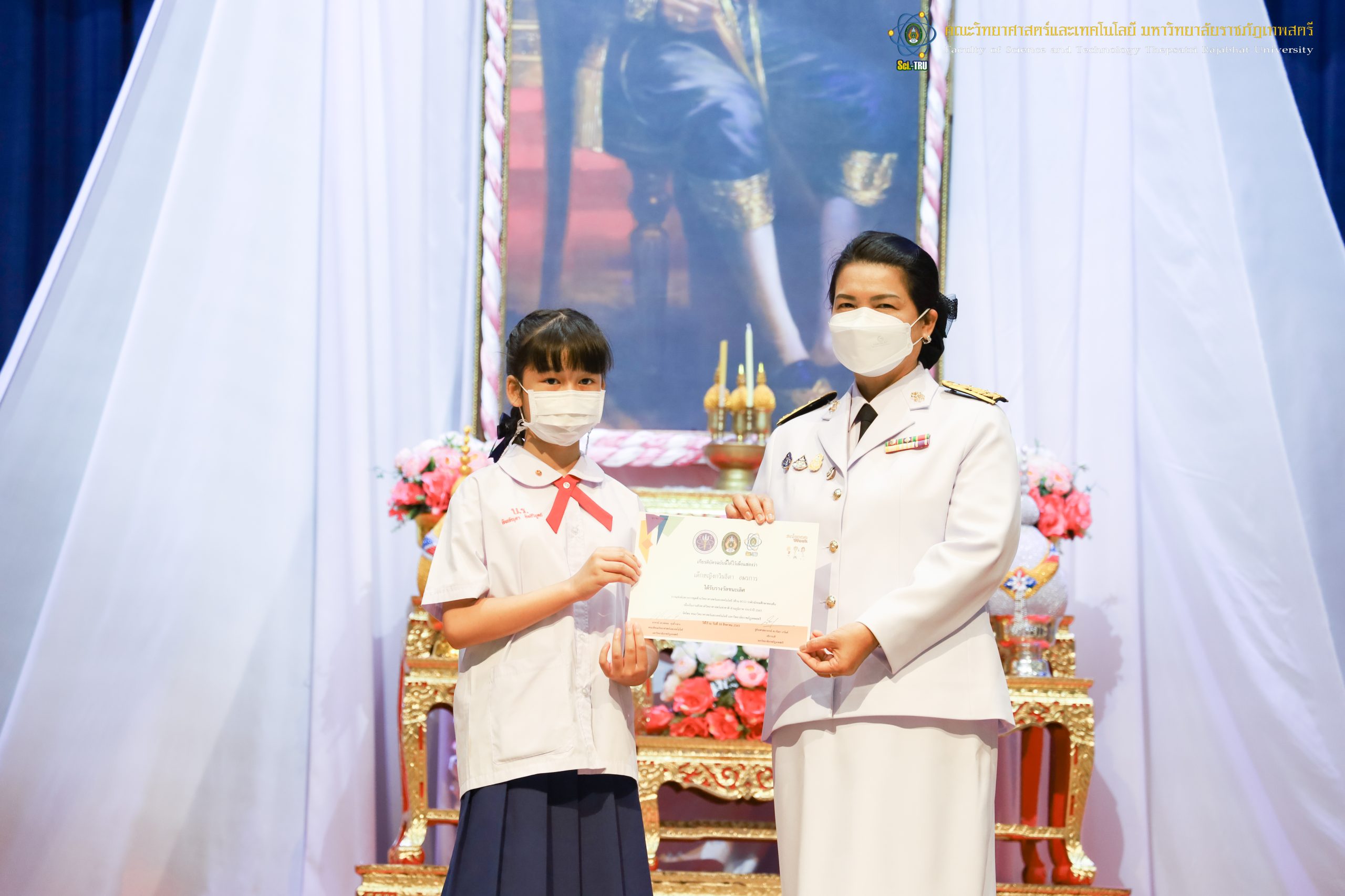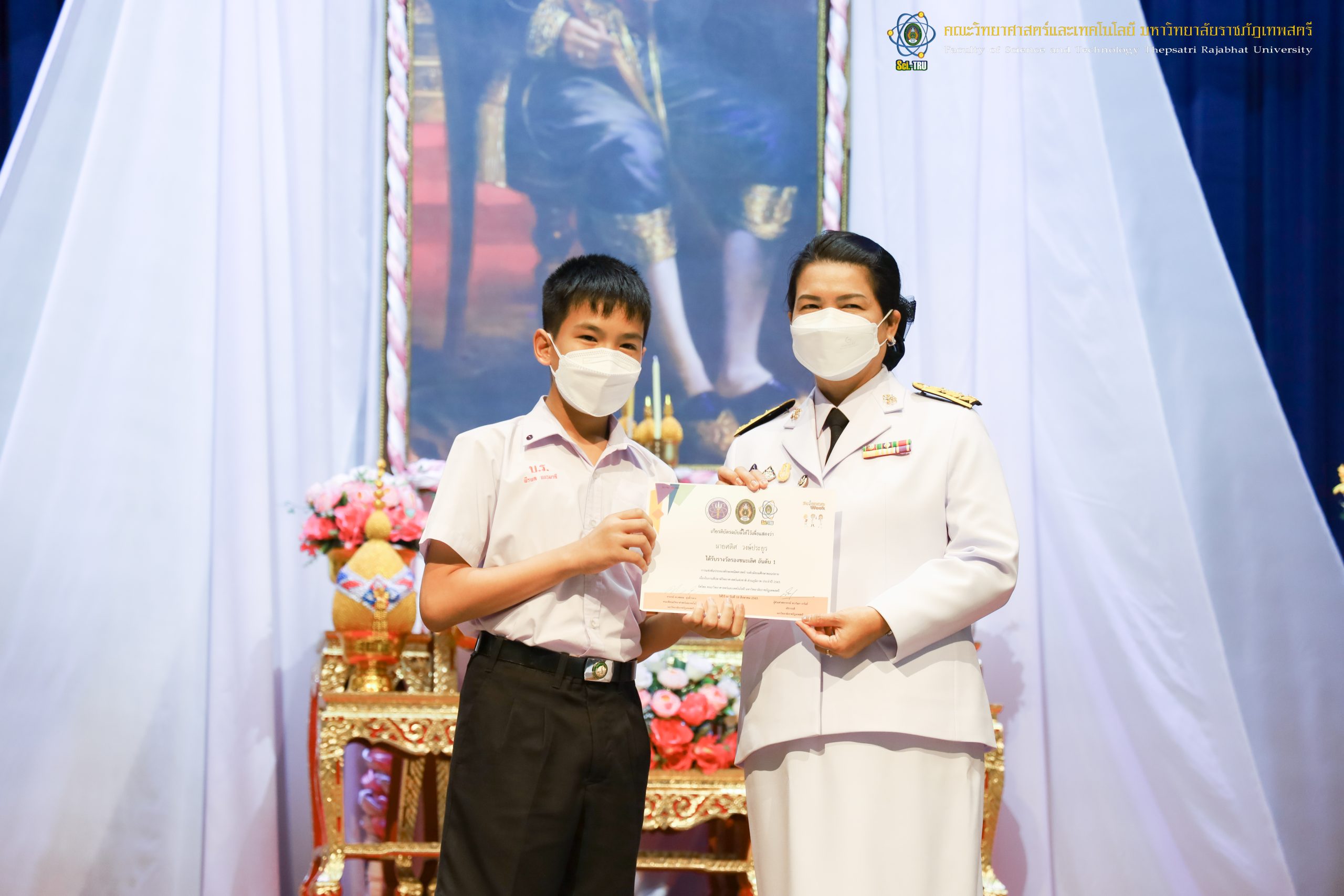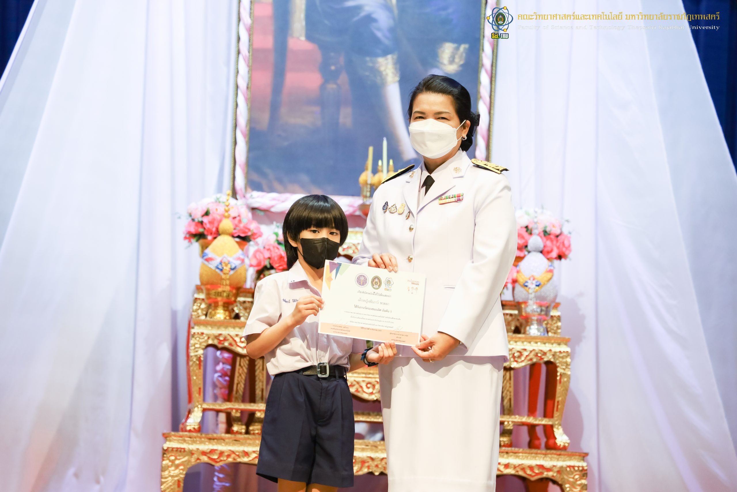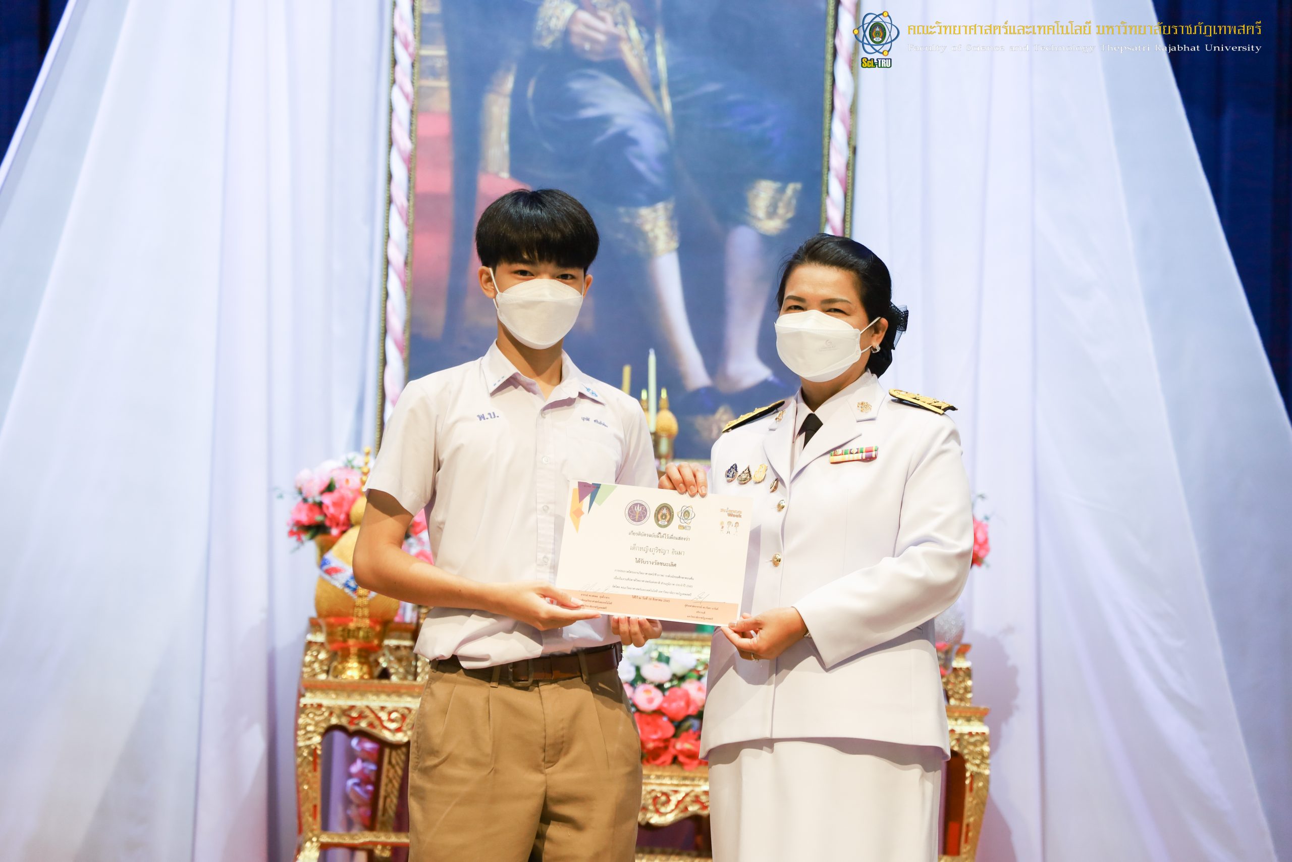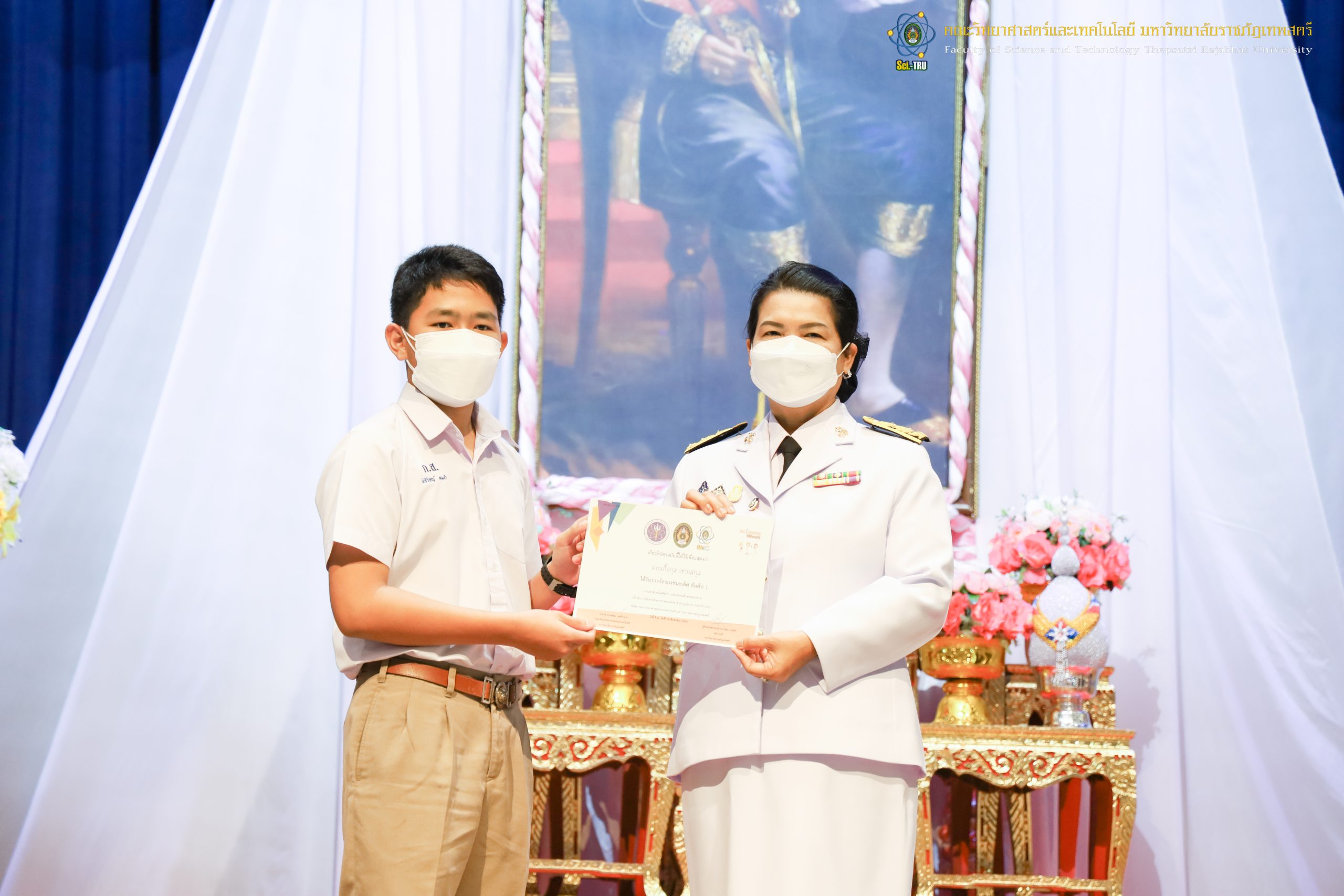 จากนั้น ผศ.ดร.กันยา บาร์นท์ อธิการบดีมหาวิทยาลัยราชภัฏเทพสตรี ได้ให้เกียรติเป็นประธานในพิธีมอบประกาศนียบัตรแก่นักเรียนที่ได้รับรางวัลจากการประกวดแข่งขันประเภทต่าง ๆ ในงานสัปดาห์วิทยาศาสตร์แห่งชาติ ส่วนภูมิภาค ประจำปี 2565 ด้วย