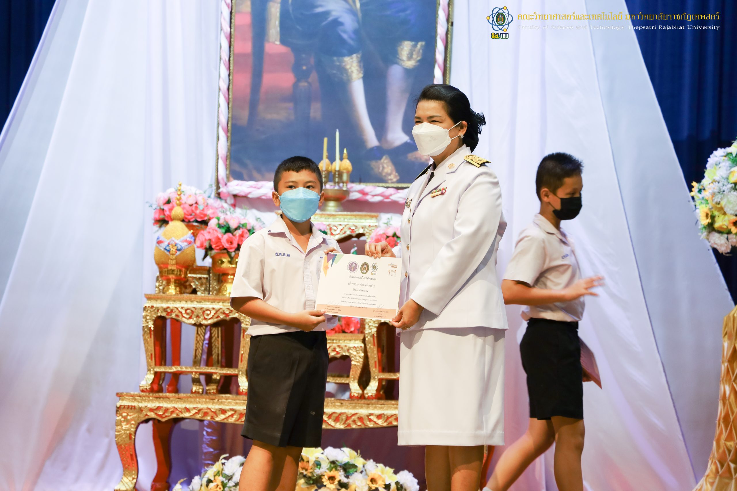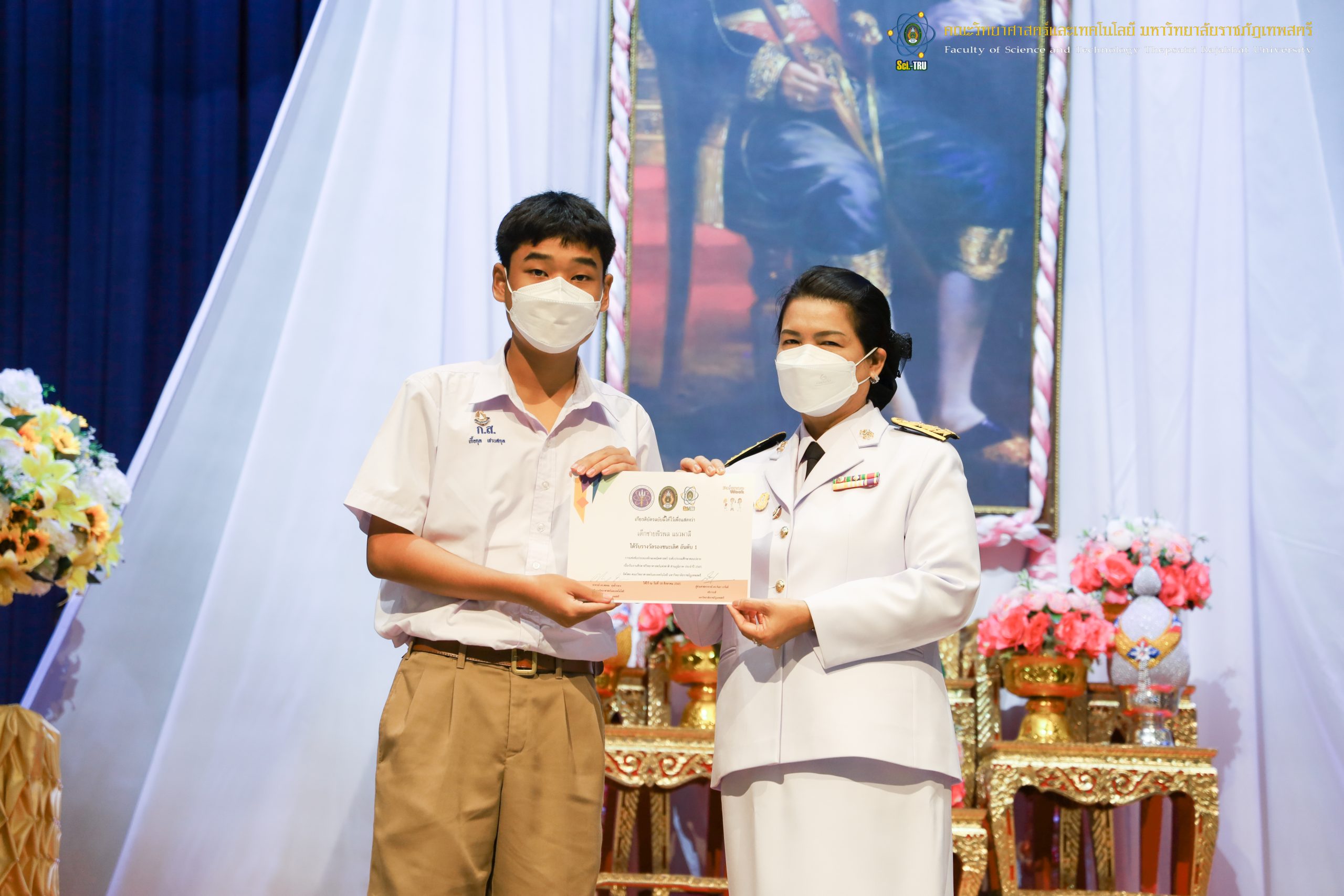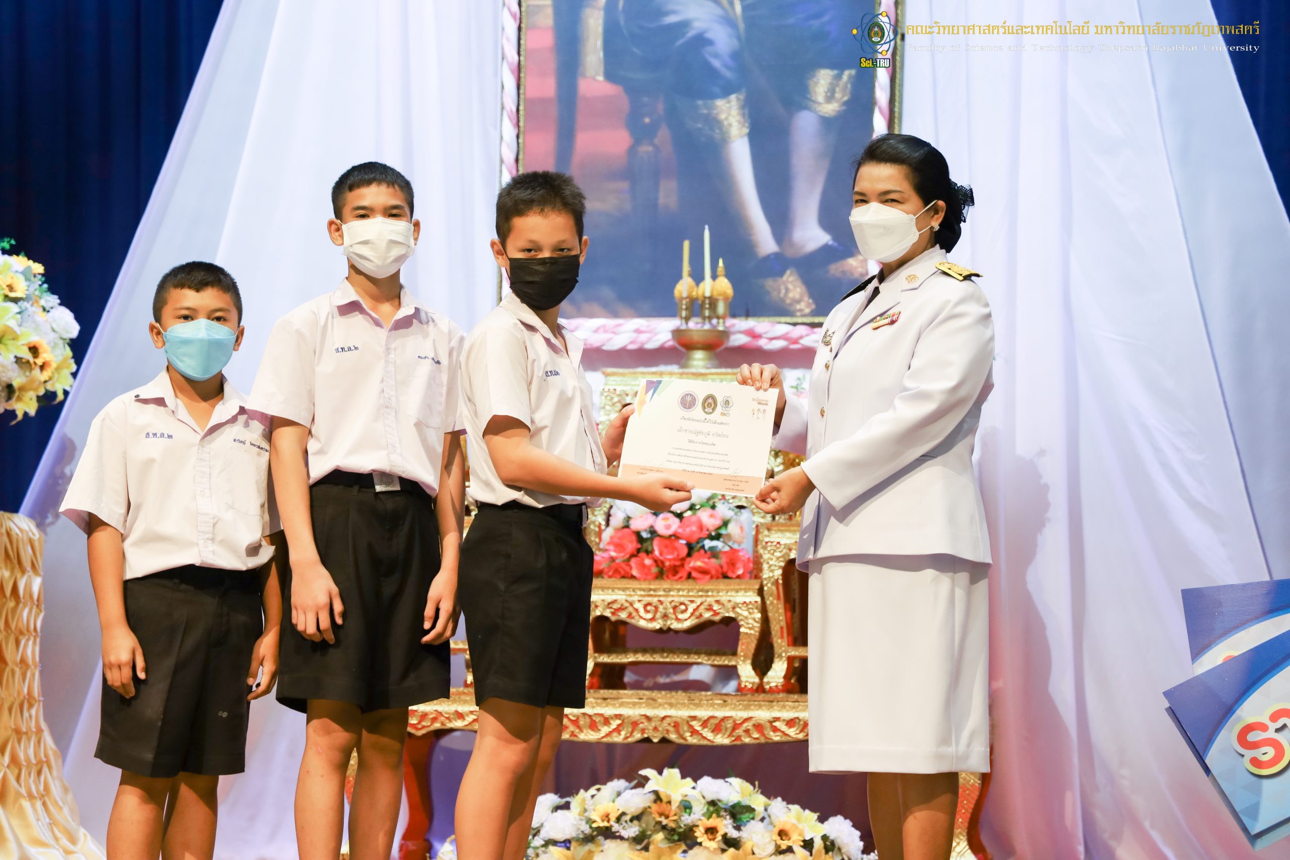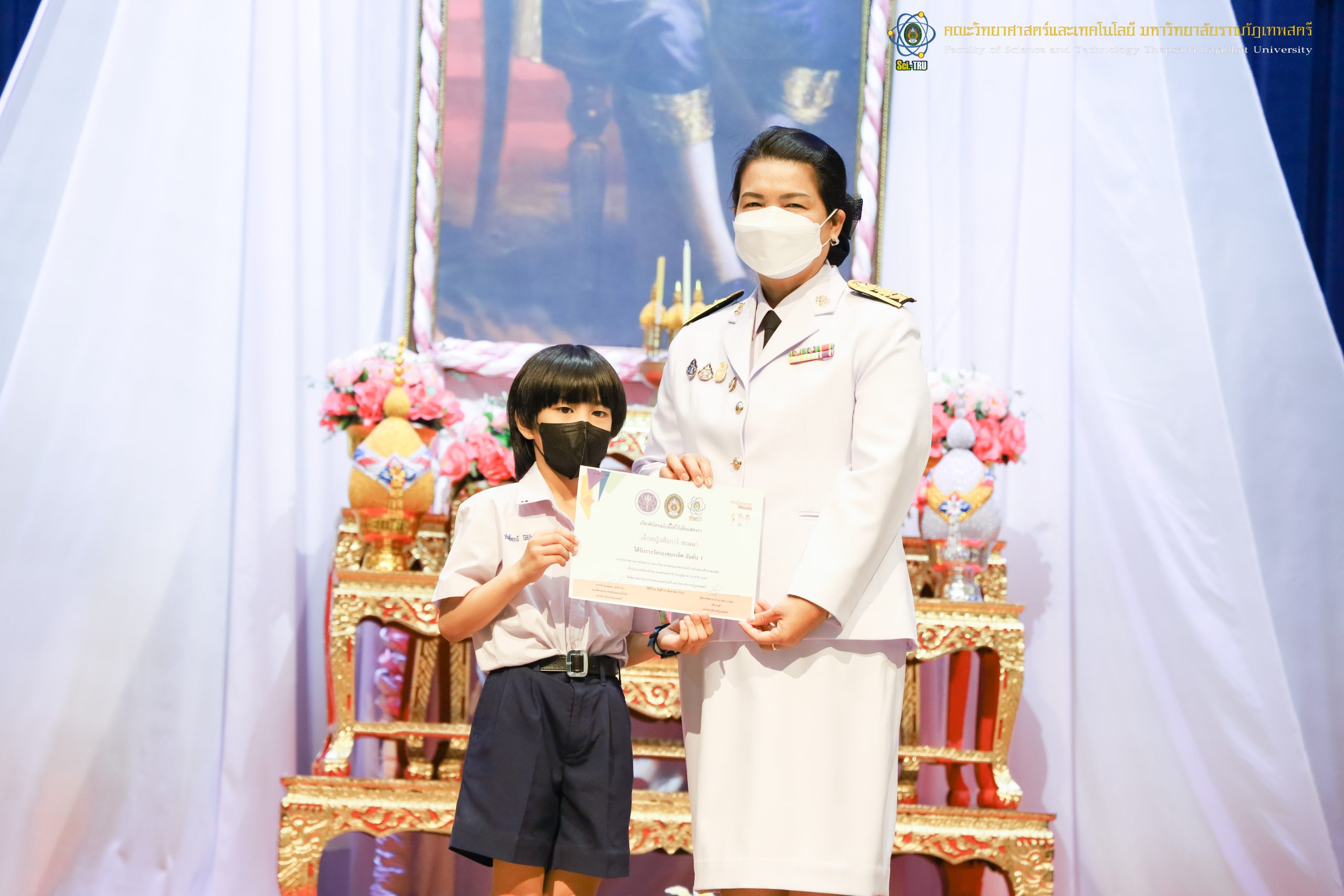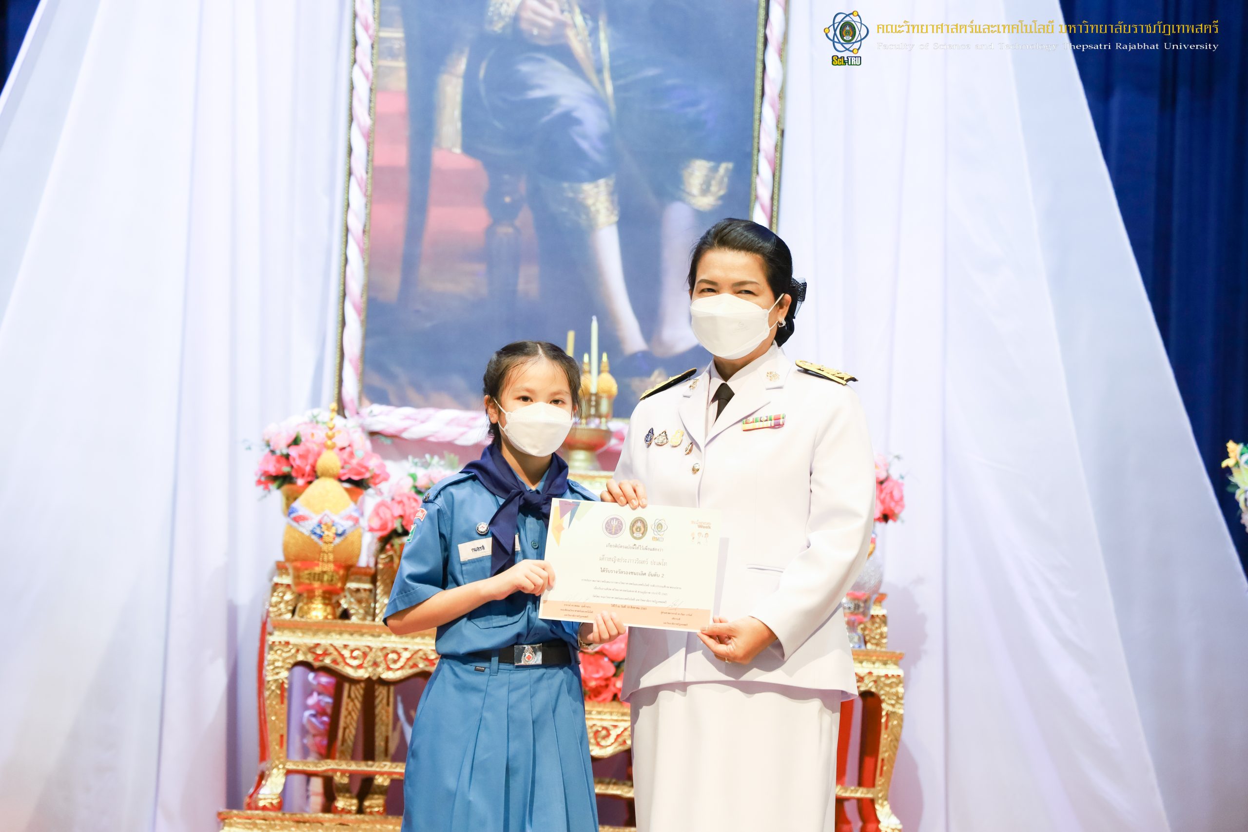 จากนั้น ผศ.ดร.กันยา บาร์นท์ อธิการบดีมหาวิทยาลัยราชภัฏเทพสตรี ได้ให้เกียรติเป็นประธานในพิธีมอบประกาศนียบัตรแก่นักเรียนที่ได้รับรางวัลจากการประกวดแข่งขันประเภทต่าง ๆ ในงานสัปดาห์วิทยาศาสตร์แห่งชาติ ส่วนภูมิภาค ประจำปี 2565 ด้วย