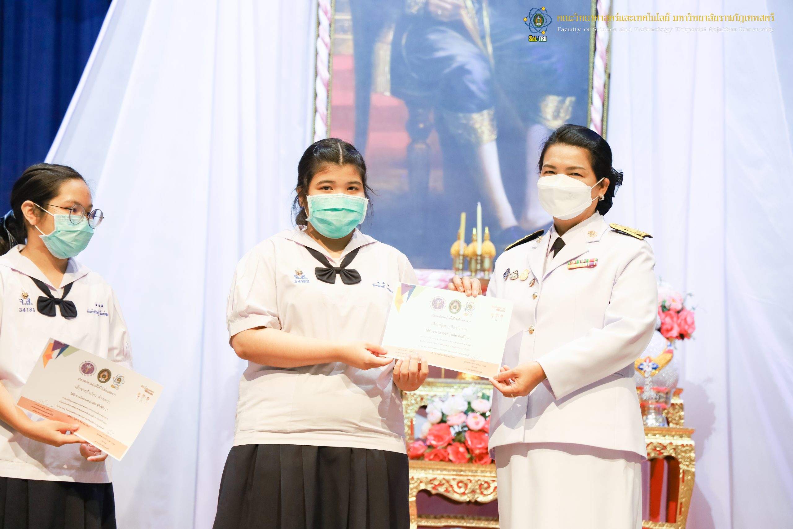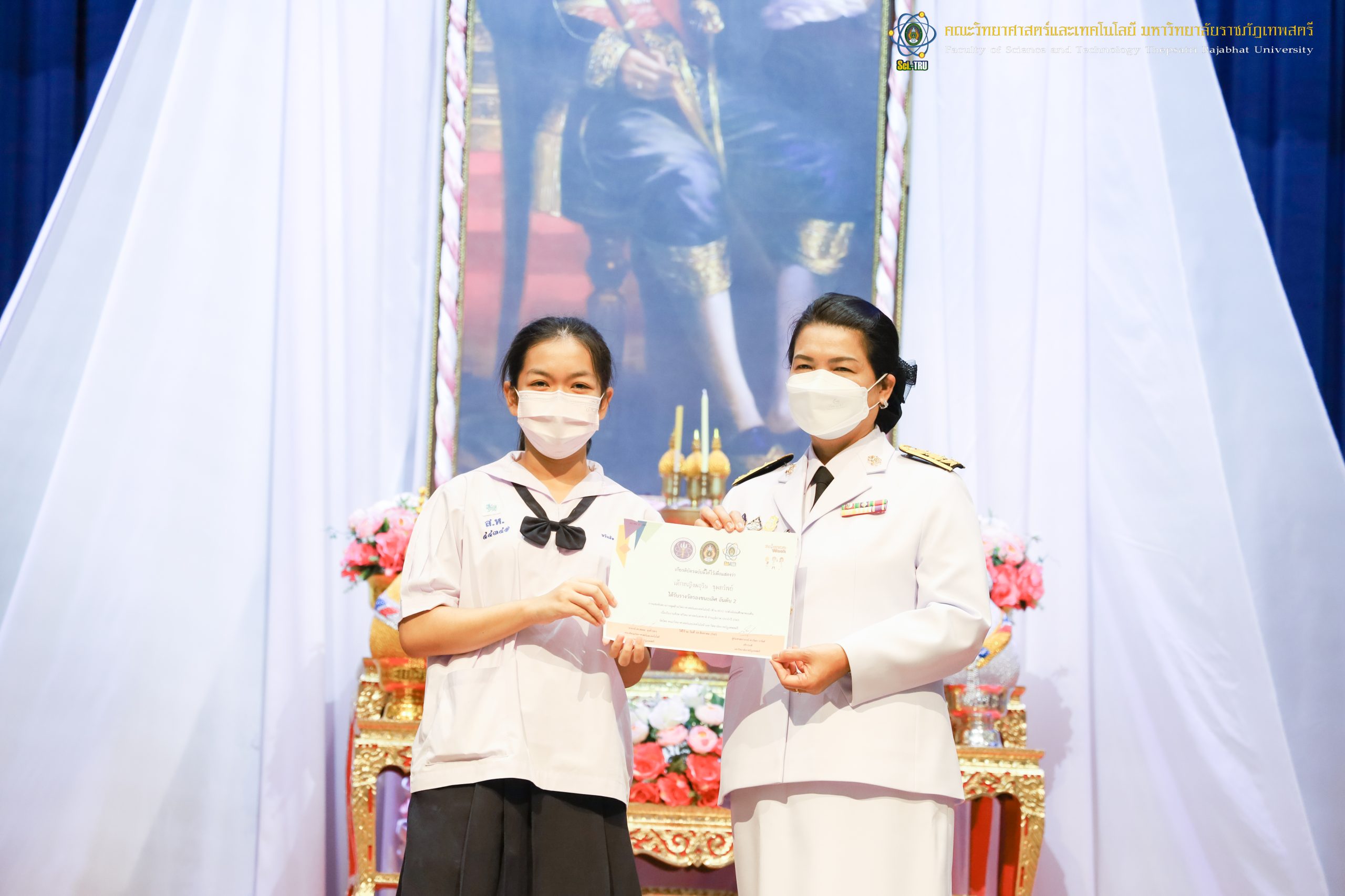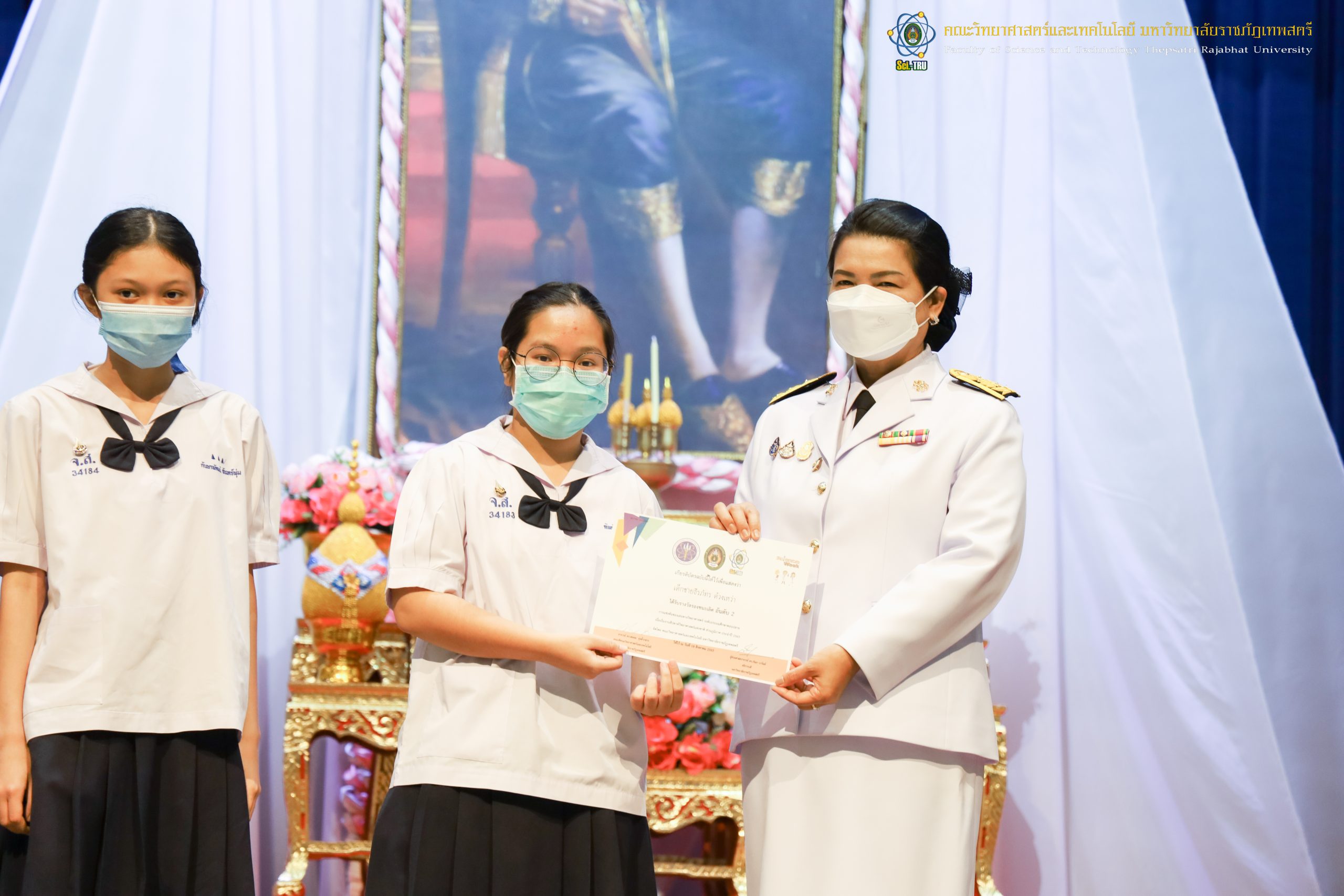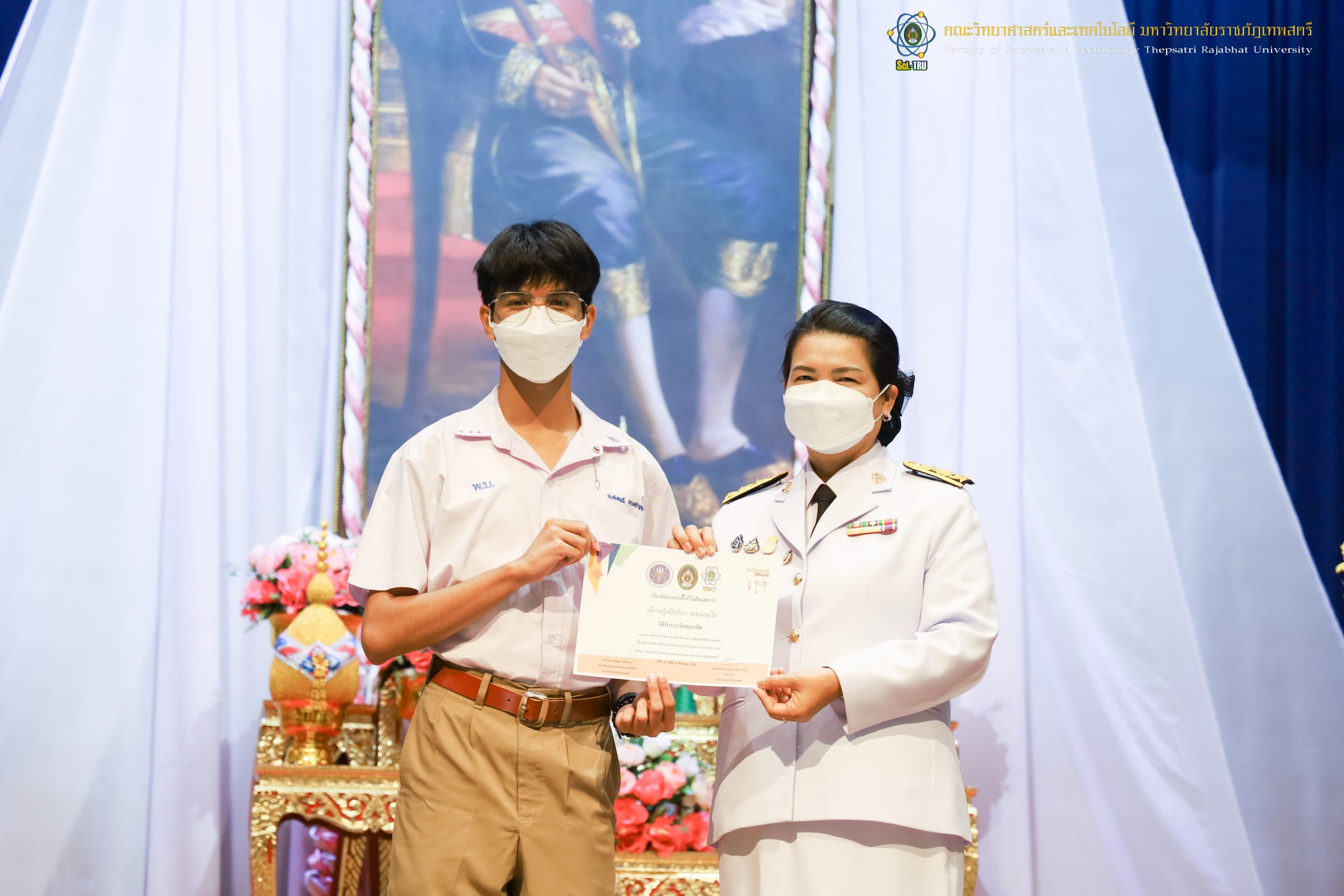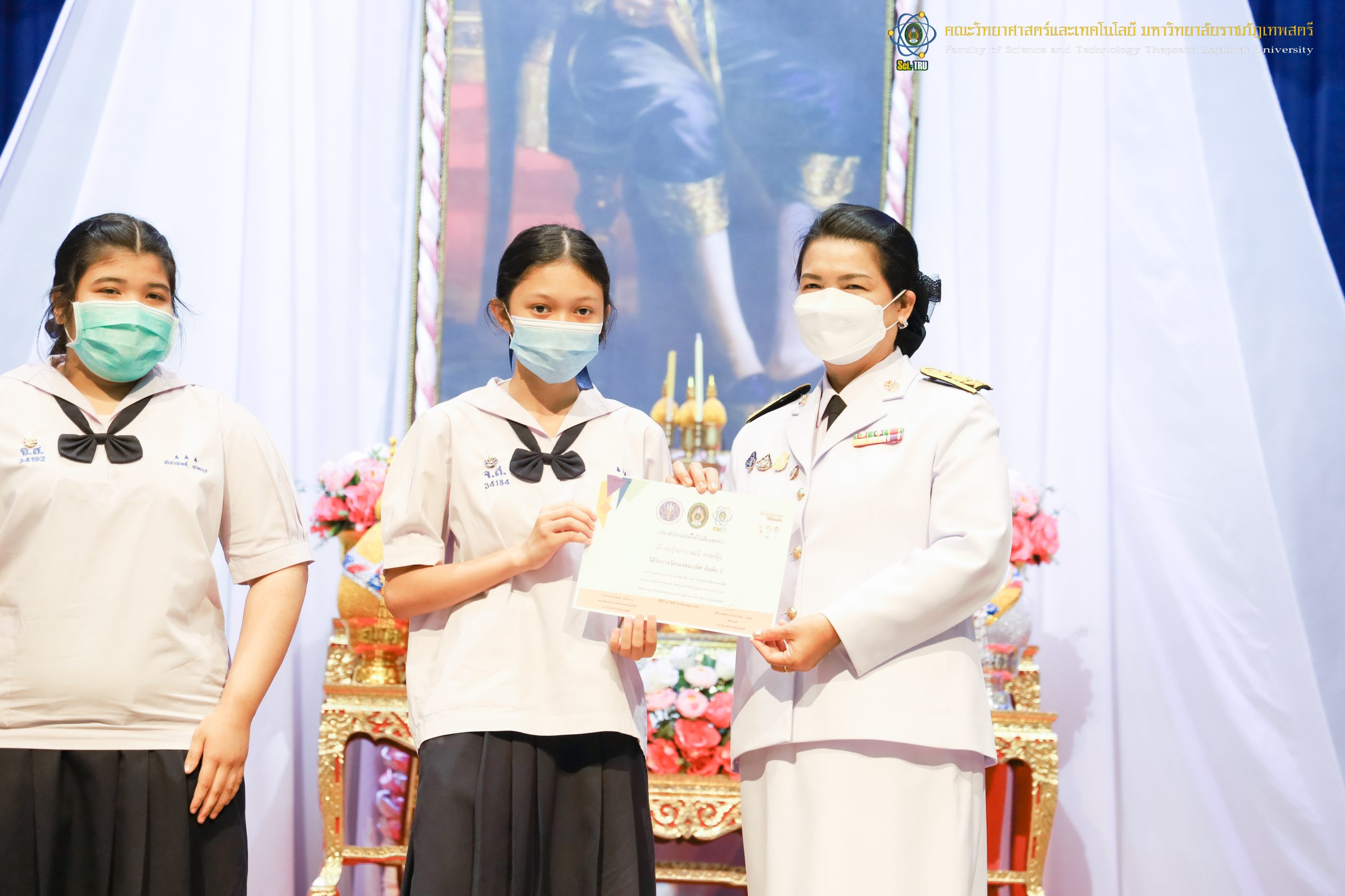 จากนั้น ผศ.ดร.กันยา บาร์นท์ อธิการบดีมหาวิทยาลัยราชภัฏเทพสตรี ได้ให้เกียรติเป็นประธานในพิธีมอบประกาศนียบัตรแก่นักเรียนที่ได้รับรางวัลจากการประกวดแข่งขันประเภทต่าง ๆ ในงานสัปดาห์วิทยาศาสตร์แห่งชาติ ส่วนภูมิภาค ประจำปี 2565 ด้วย
