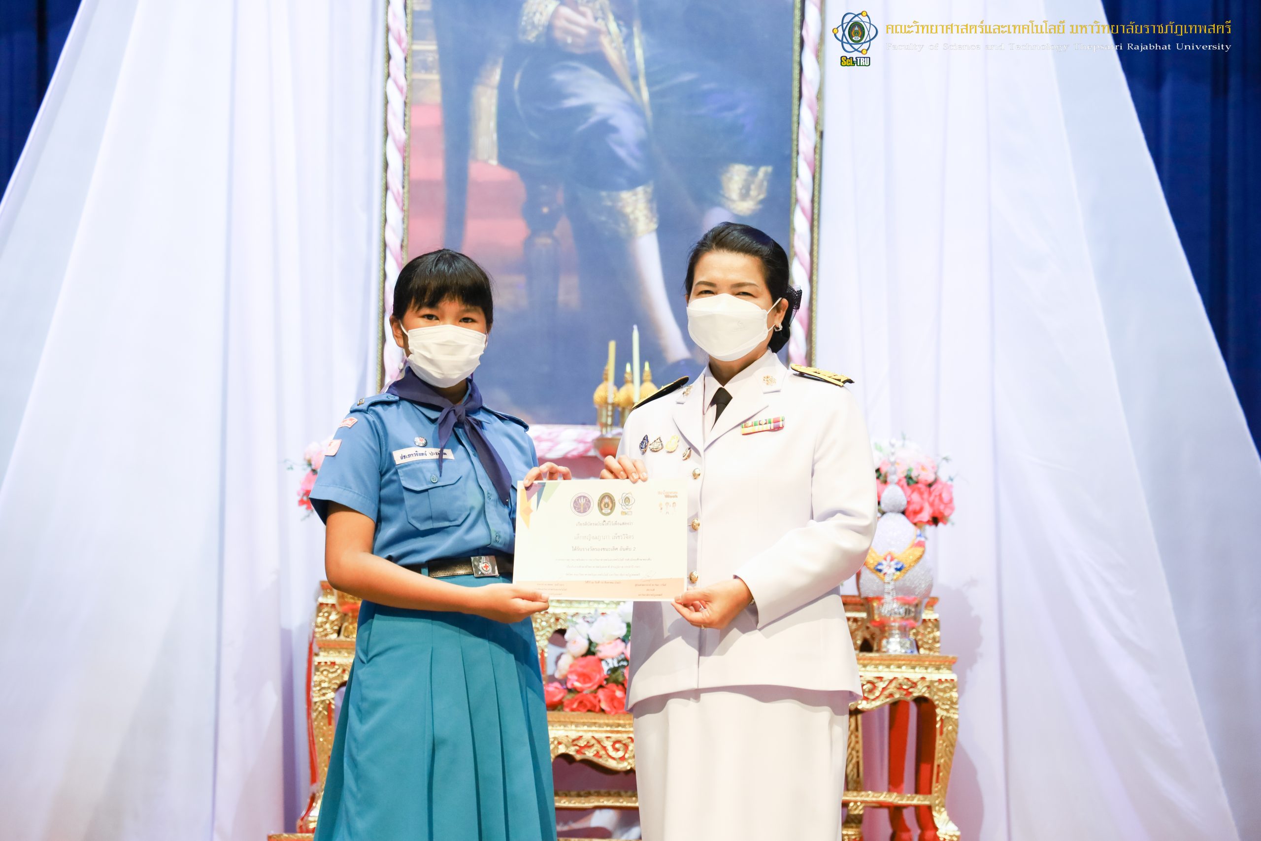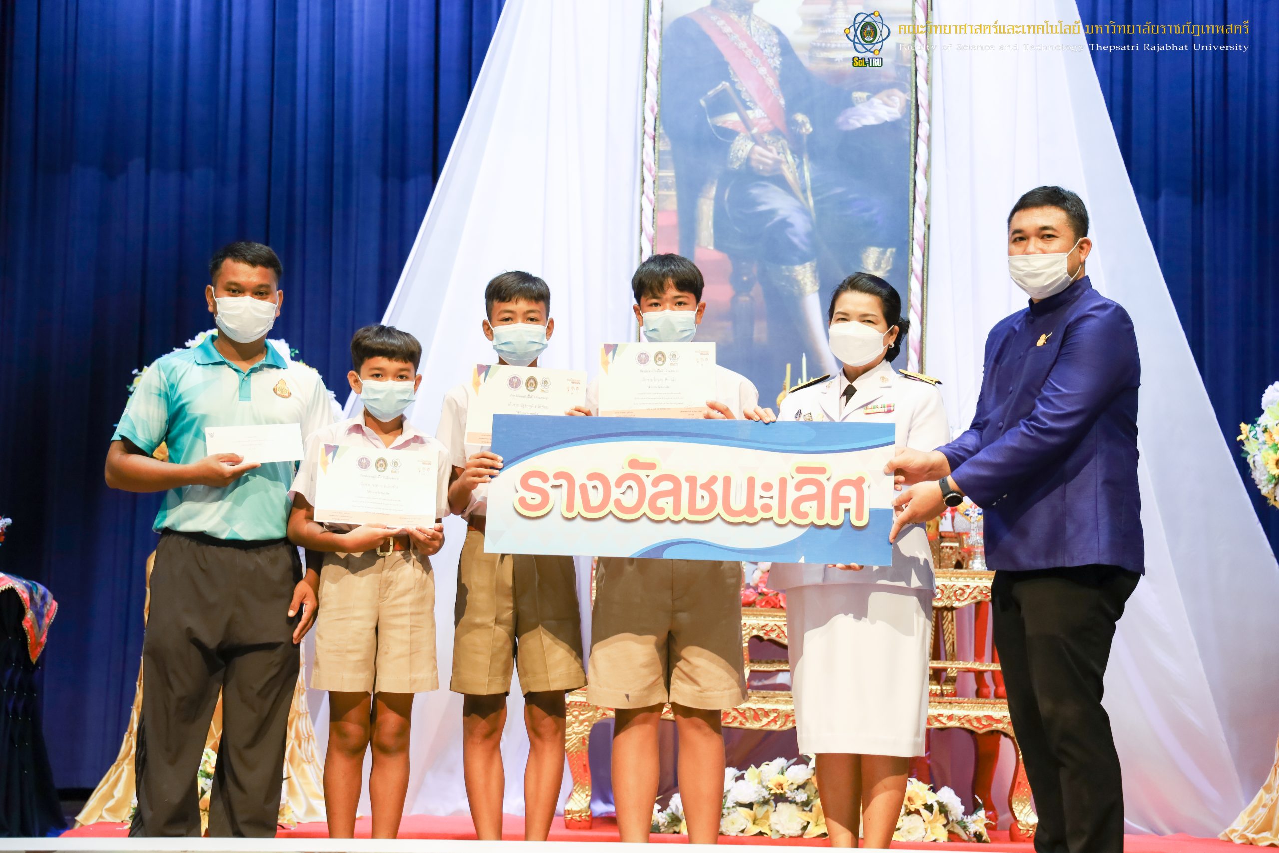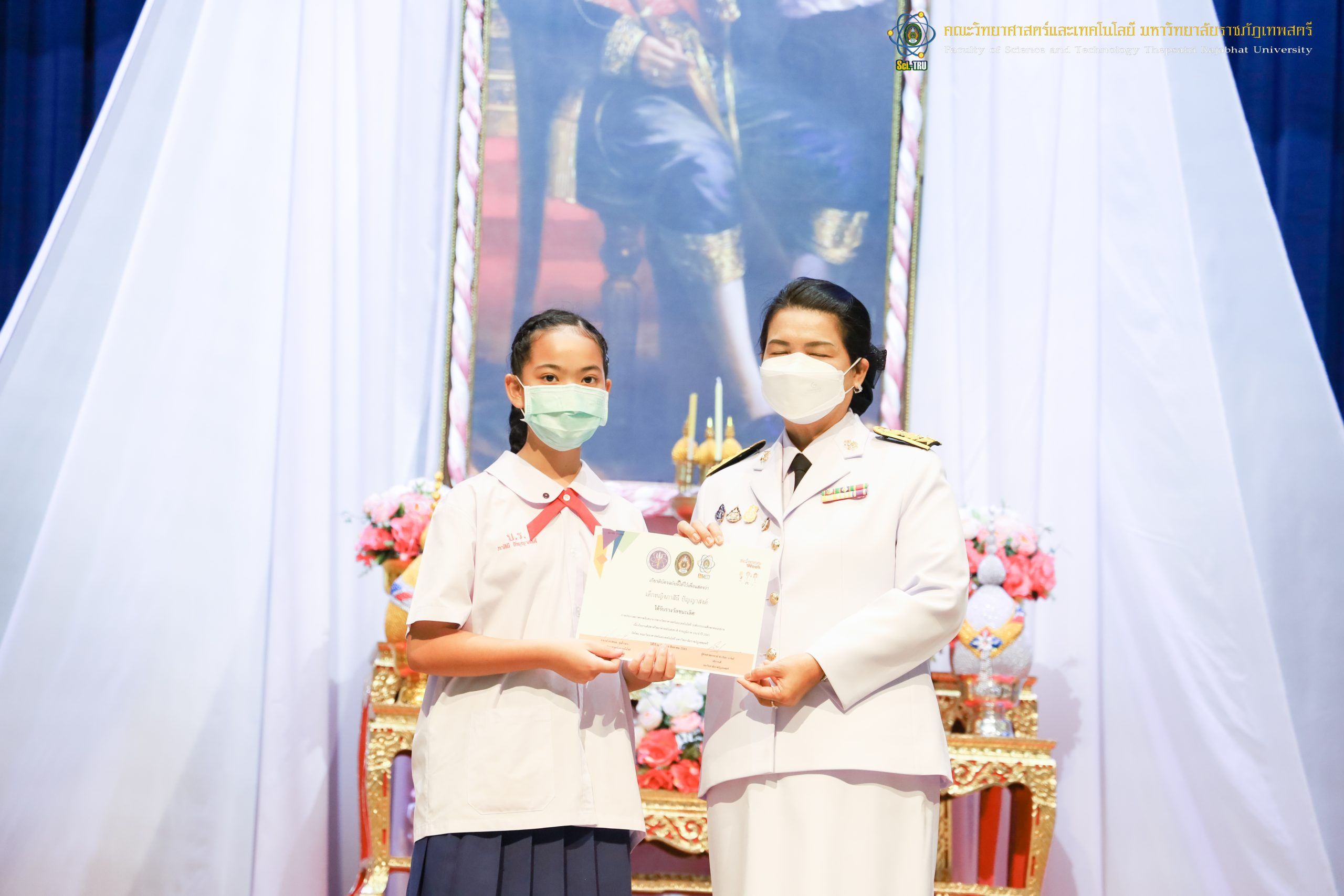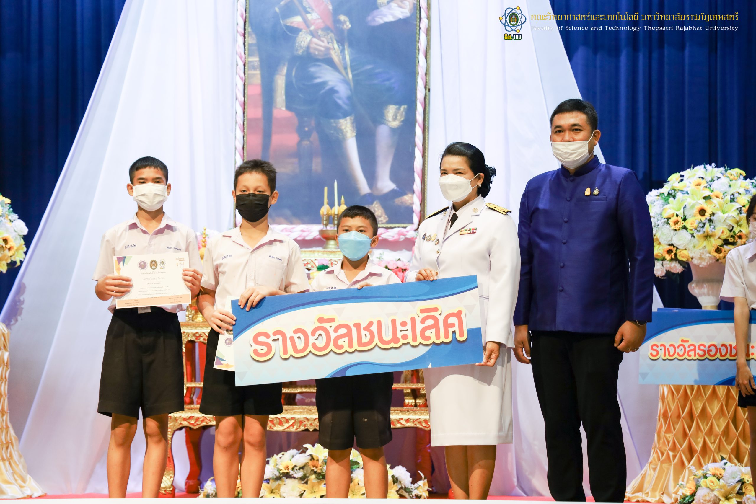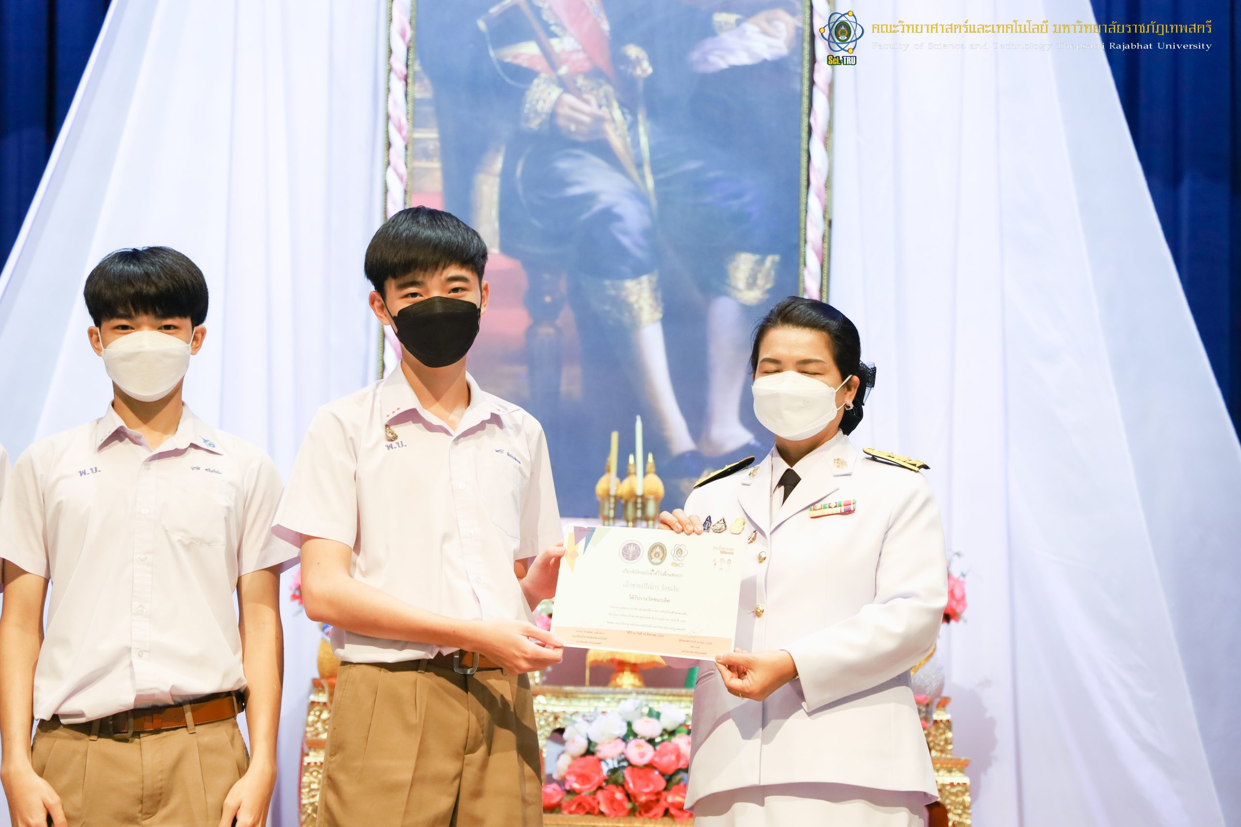 จากนั้น ผศ.ดร.กันยา บาร์นท์ อธิการบดีมหาวิทยาลัยราชภัฏเทพสตรี ได้ให้เกียรติเป็นประธานในพิธีมอบประกาศนียบัตรแก่นักเรียนที่ได้รับรางวัลจากการประกวดแข่งขันประเภทต่าง ๆ ในงานสัปดาห์วิทยาศาสตร์แห่งชาติ ส่วนภูมิภาค ประจำปี 2565 ด้วย