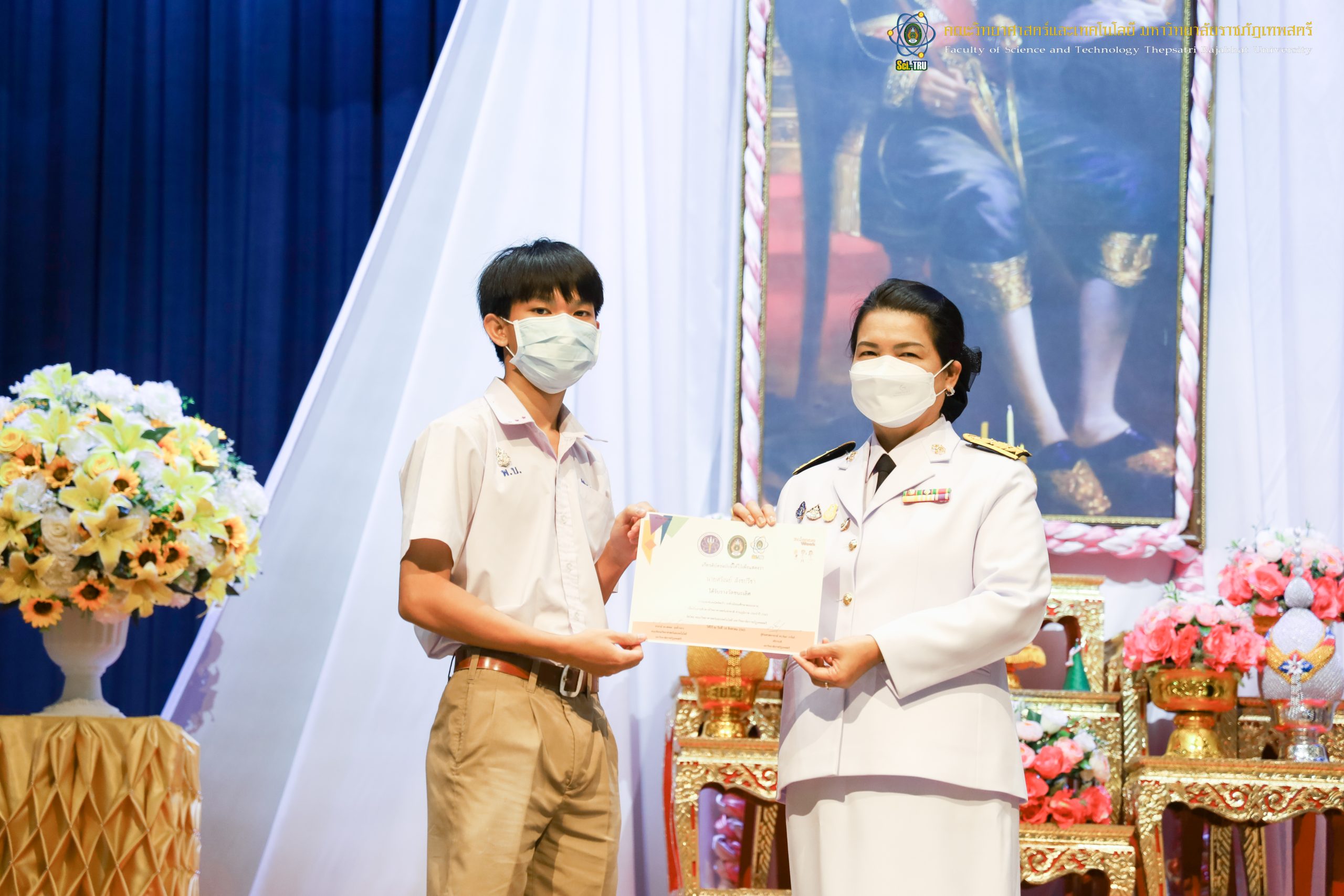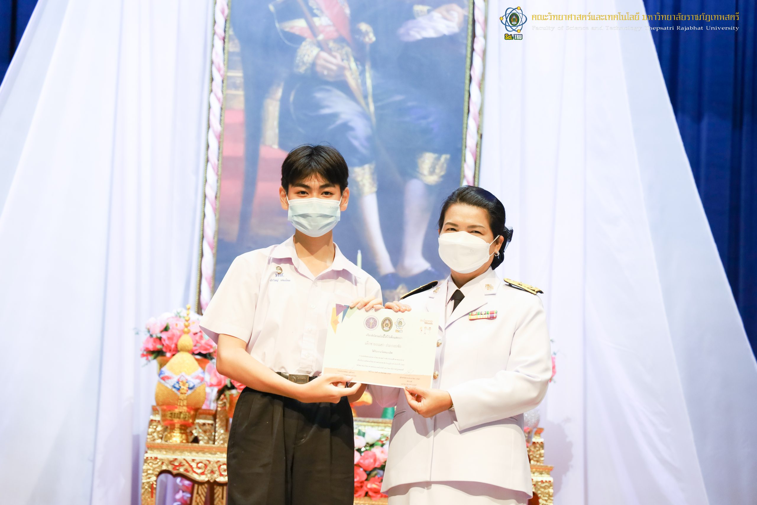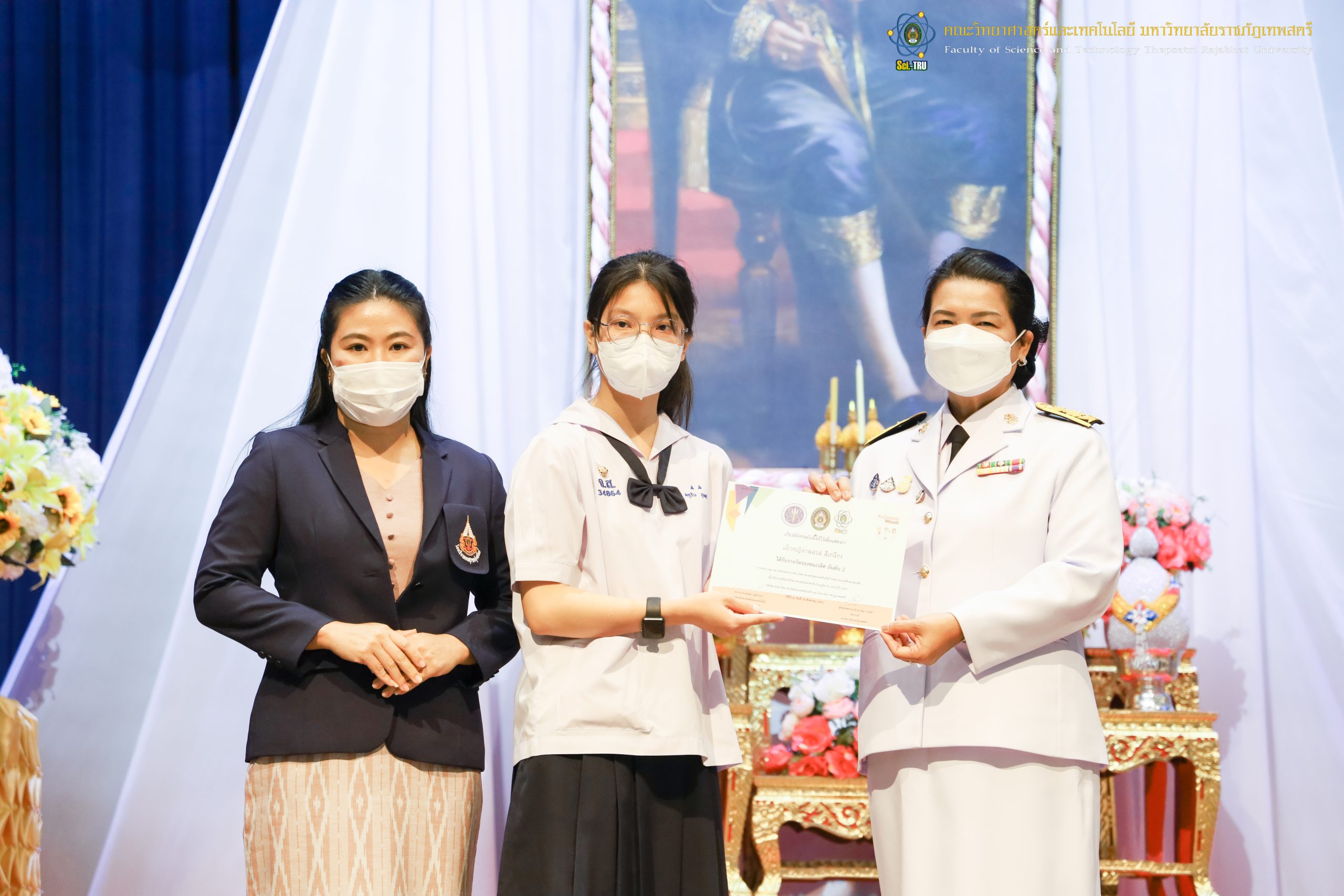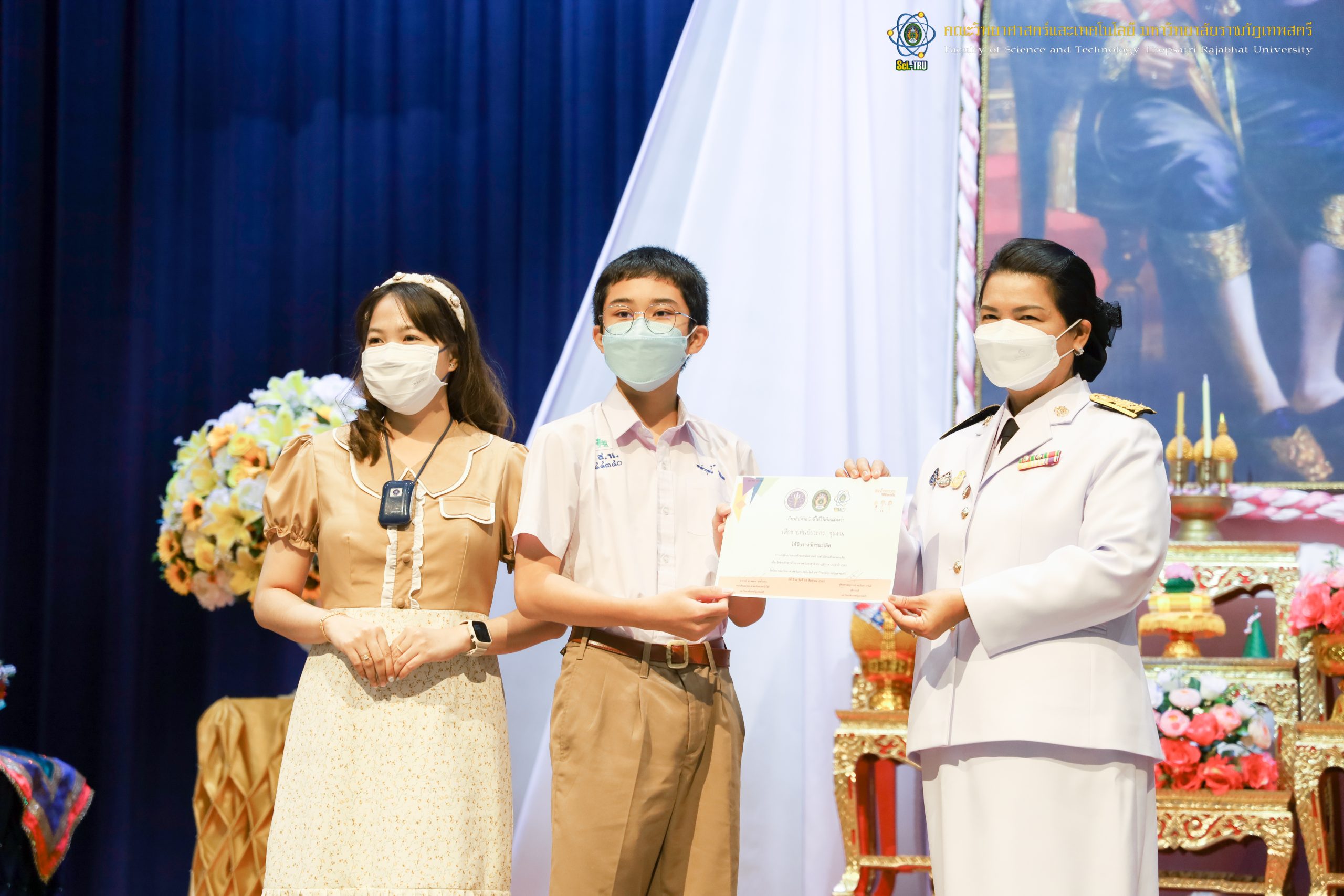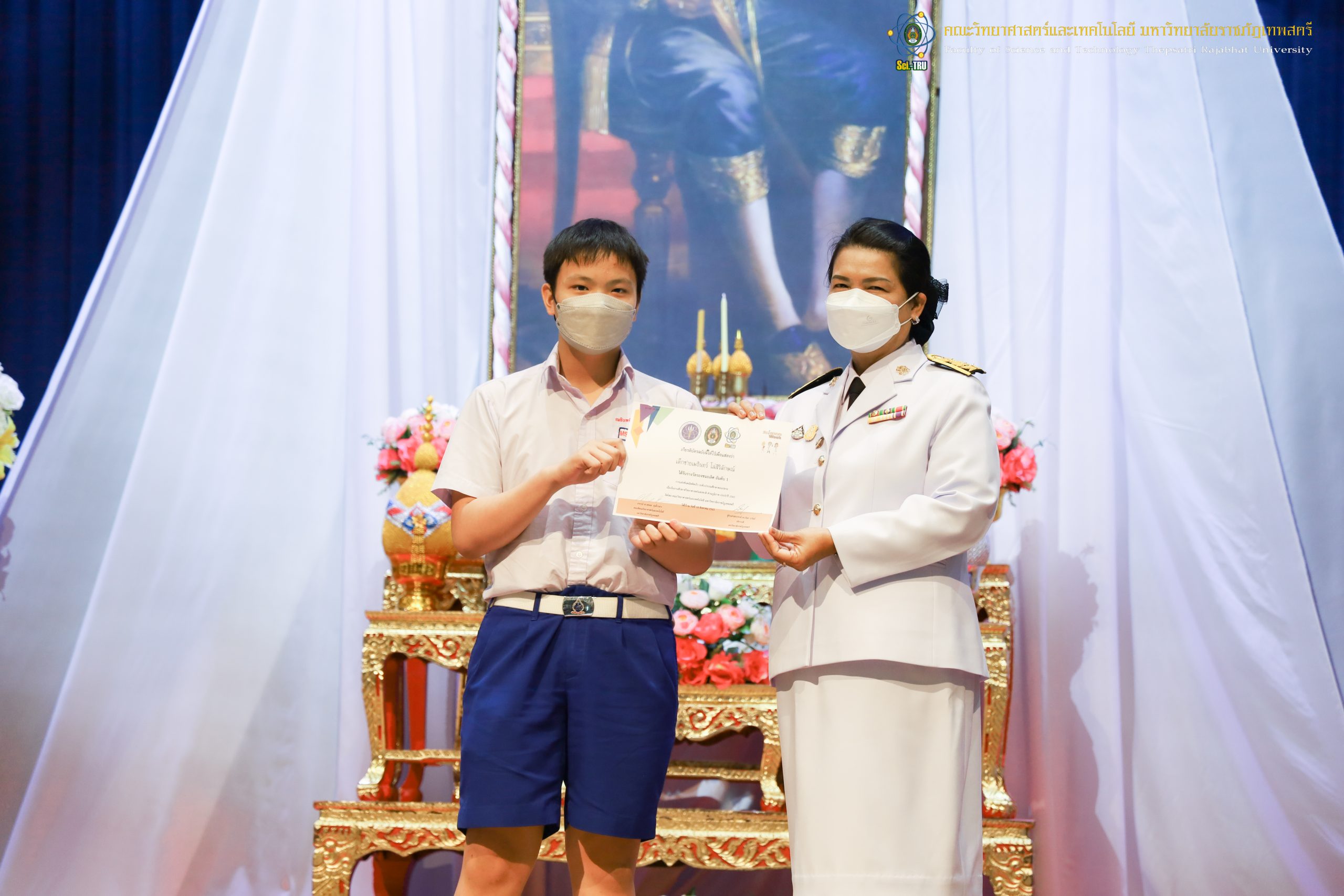 จากนั้น ผศ.ดร.กันยา บาร์นท์ อธิการบดีมหาวิทยาลัยราชภัฏเทพสตรี ได้ให้เกียรติเป็นประธานในพิธีมอบประกาศนียบัตรแก่นักเรียนที่ได้รับรางวัลจากการประกวดแข่งขันประเภทต่าง ๆ ในงานสัปดาห์วิทยาศาสตร์แห่งชาติ ส่วนภูมิภาค ประจำปี 2565 ด้วย