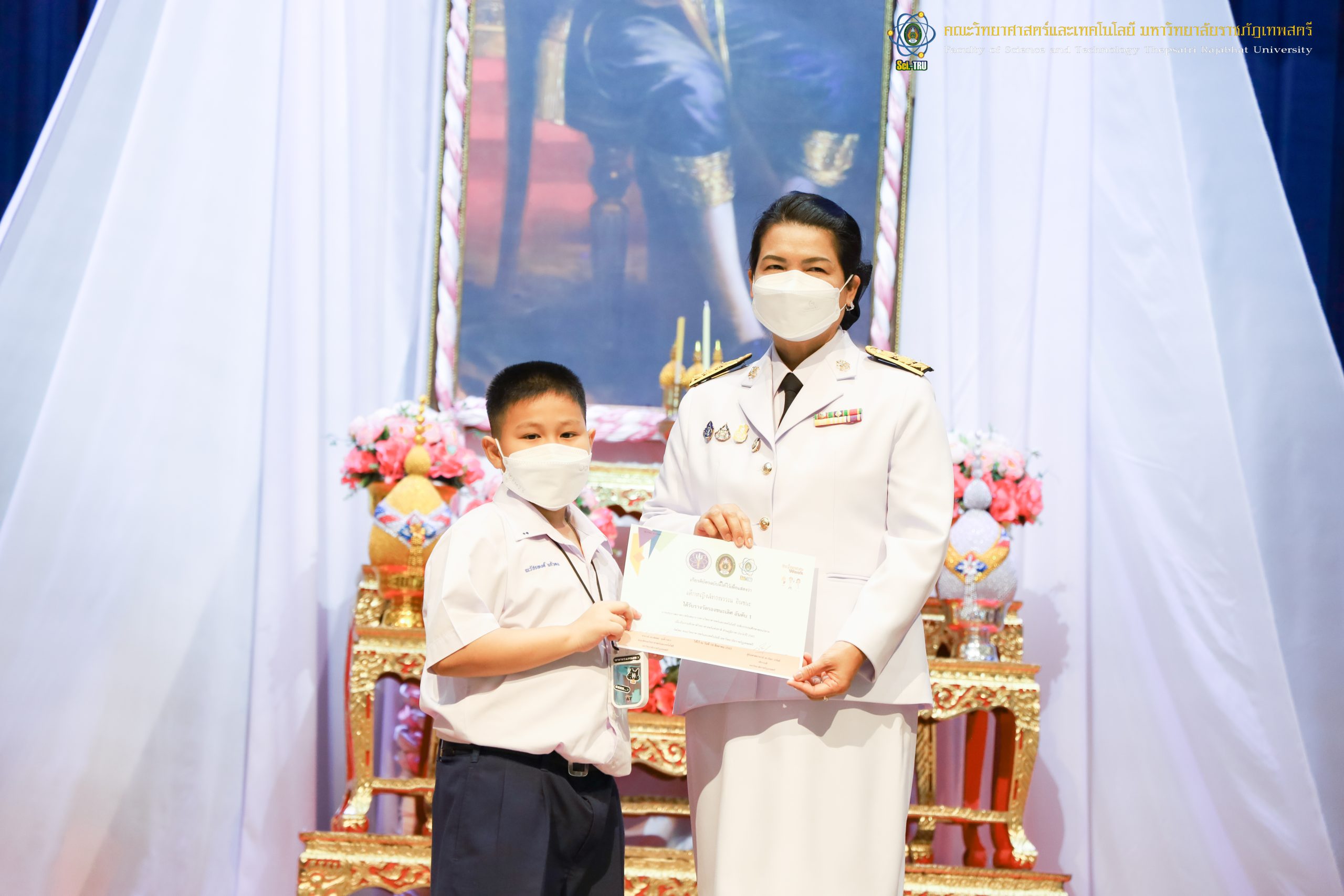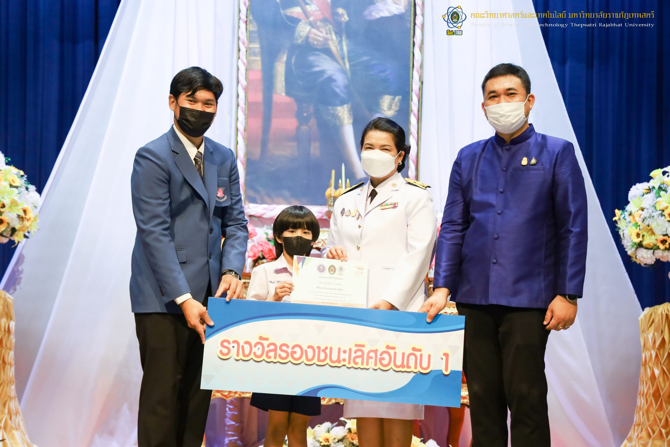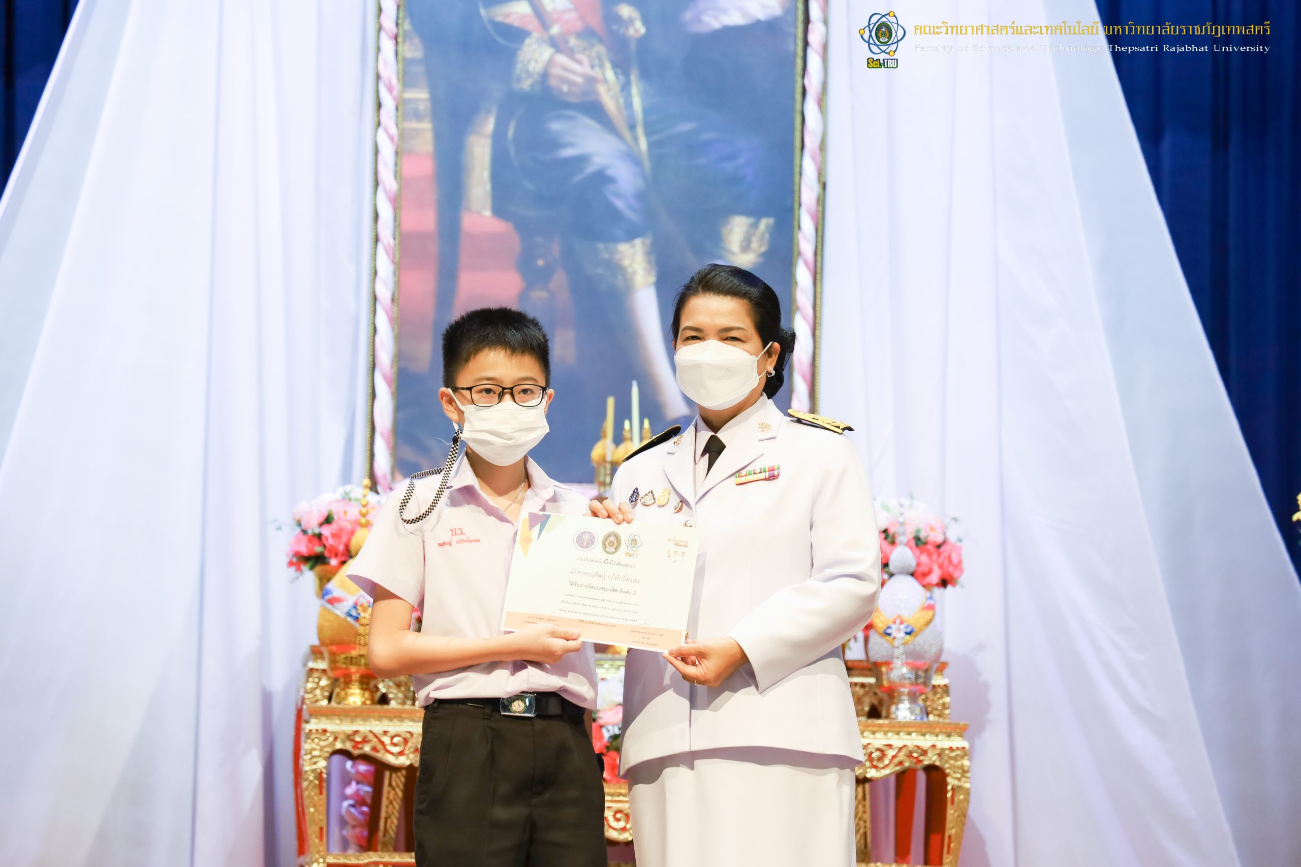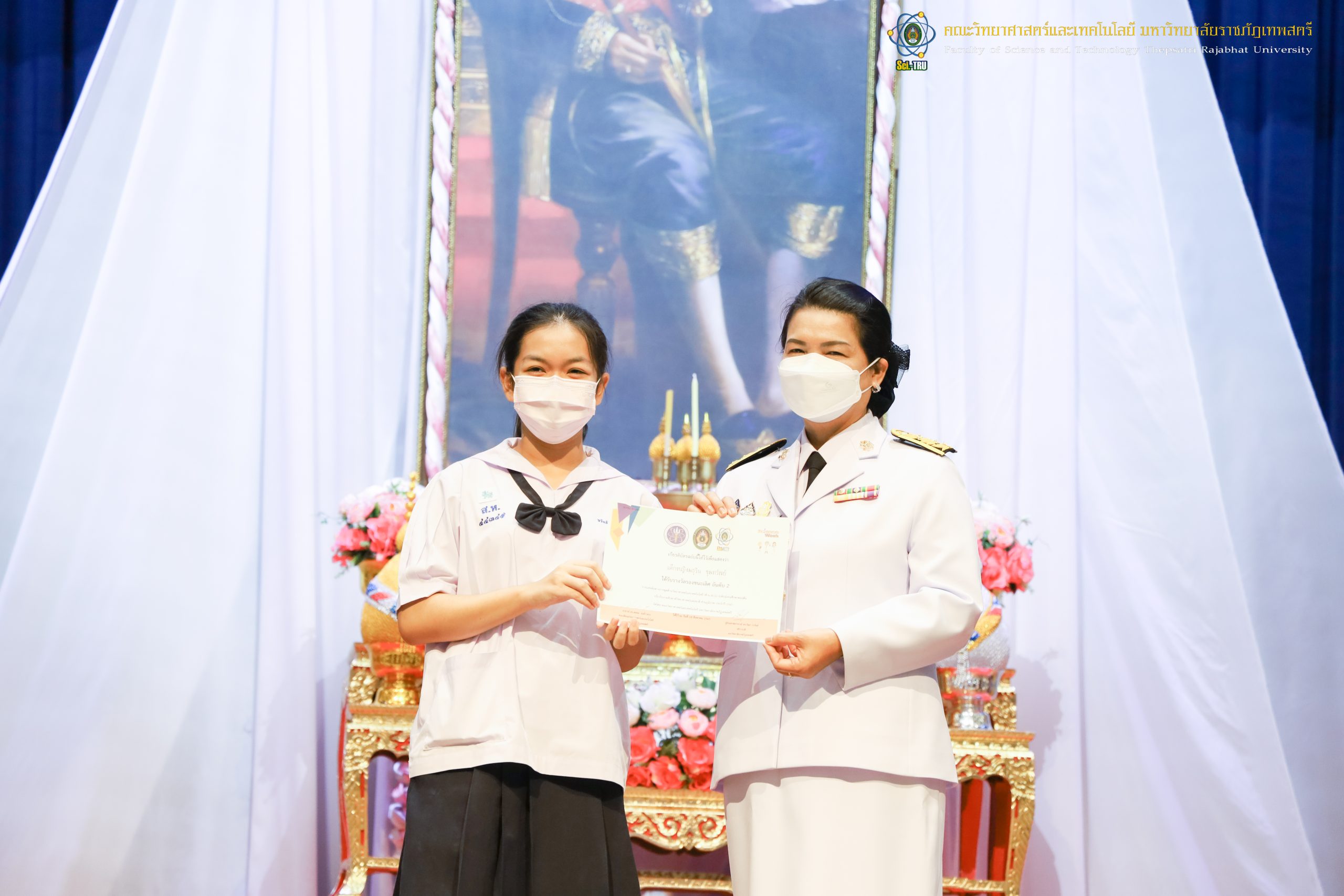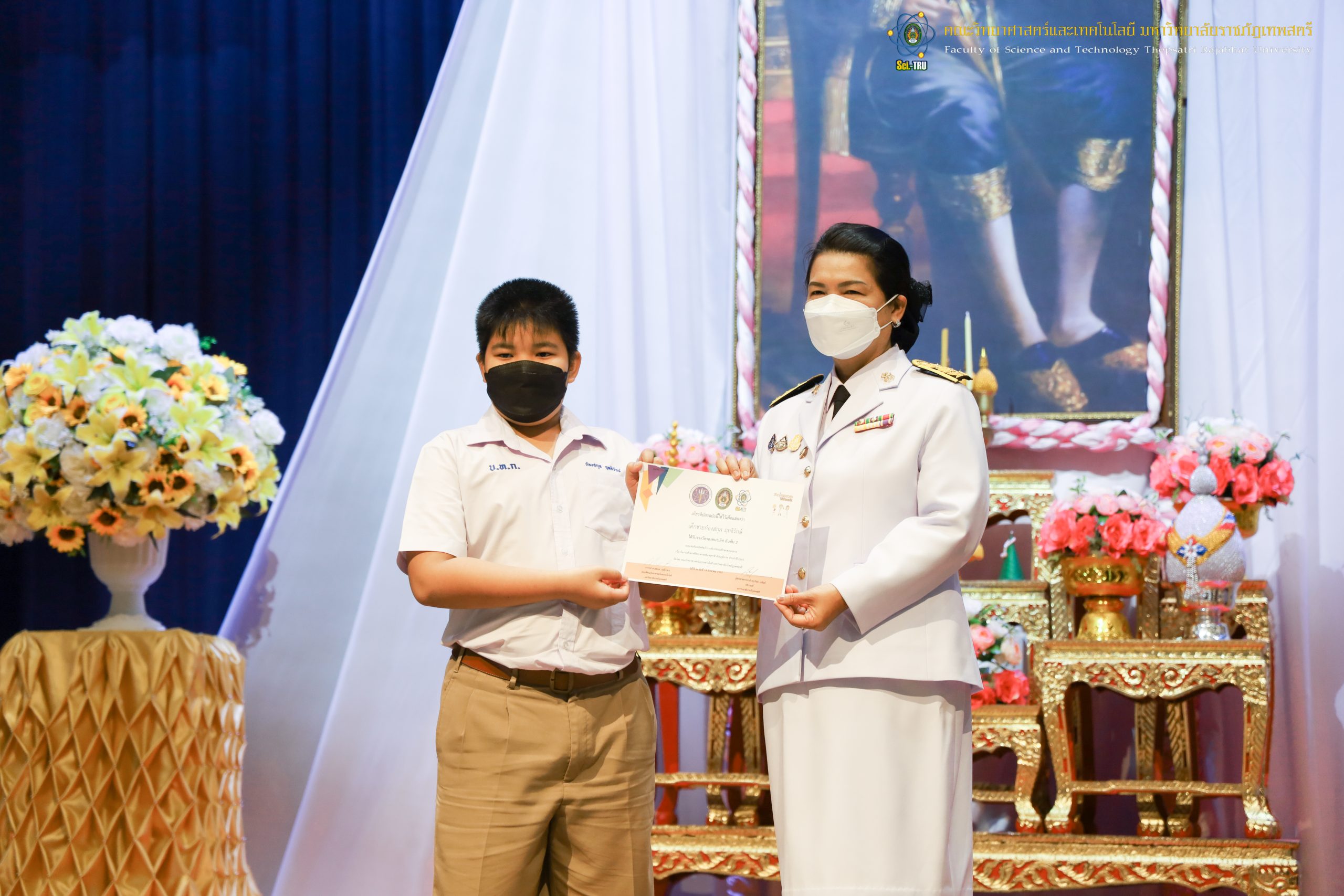 จากนั้น ผศ.ดร.กันยา บาร์นท์ อธิการบดีมหาวิทยาลัยราชภัฏเทพสตรี ได้ให้เกียรติเป็นประธานในพิธีมอบประกาศนียบัตรแก่นักเรียนที่ได้รับรางวัลจากการประกวดแข่งขันประเภทต่าง ๆ ในงานสัปดาห์วิทยาศาสตร์แห่งชาติ ส่วนภูมิภาค ประจำปี 2565 ด้วย